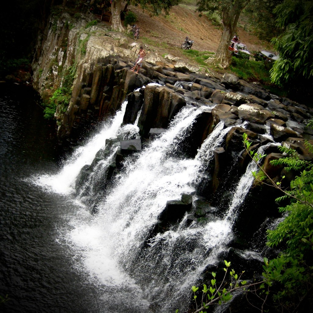 Den nächsten Tag fahren wir wieder durch das Landesinnere. Durch Zuckerrohrfelder und Zuckerrohrfelder und … Zuckerrohrfelder geht es Richtung Süden, zu den Rochester Falls. Wir parken unseren Sparky auf einem kleinen Parkplatz und schon sind wir von Einheimischen umlagert. Alle wollen uns im kleinen Park der Wasserfälle umherführen. Wir schließen uns einem jungen Mann an, der sich Jim nennt, und schon geht es los. Etwa zehn Meter stürzt das Wasser hier in die Tiefe. „Laßt uns nach unten gehen, dort könnt ihr schwimmen“, schlägt unser Begleiter vor. Bei den Temperaturen hört sich das sehr verlockend an. Über einen kleinen Waldweg gelangen wir an einen See, der sich unterhalb des Wasserfalles gebildet hat, bevor das Wasser in einem Fluß seinen weiteren Weg über die Insel sucht. Jim passt auf die Kleidung auf, während wir uns im Wasser erfrischen und das herabstürzende Nass auf den Körper prasseln lassen. Beeindruckend schaut diese Kulisse aus. Die Felsen erscheinen fast schwarz und das Wasser strahlend weiß. Erfrischt steigen wir auf der anderen Seite den Berg hinauf und springen dann von Stein zu Stein zurück zum gegenüberliegenden Ufer. Wir gönnen uns noch eine frische Kokosnuss, bevor wir, immer noch nass, in unseren Sparky steigen.
