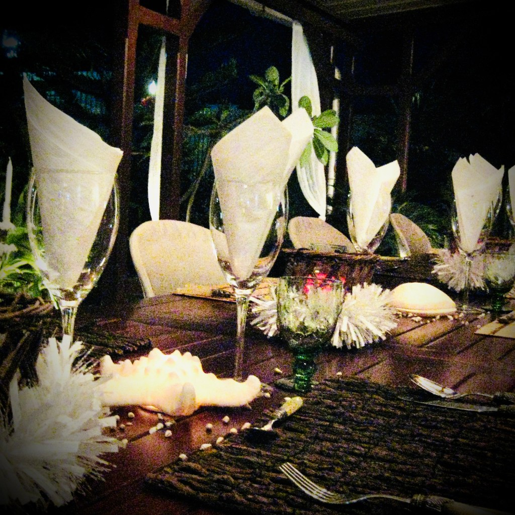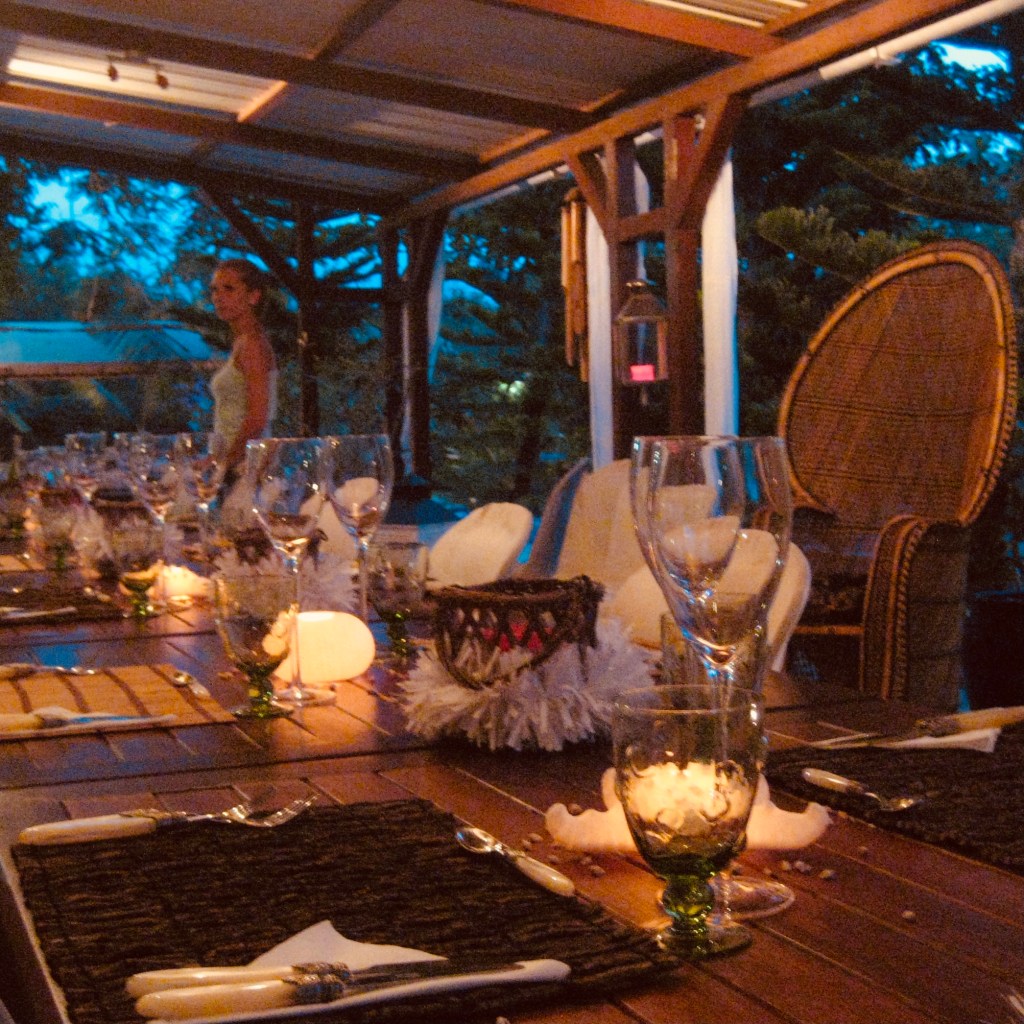 Abends sitzen wir an einer großen, langen Tafel auf der Terrasse des Hotels. Die Eigentümer haben gekocht und die Gäste genießen nun zusammen mit ihnen dieses vorzügliche Abendmahl. Mit Teelichtern beleuchtete Muscheln erhellen warm den stilvoll gedeckten Tisch. Das Essen ist einfach, aber von bester Qualität. Es gibt eine hausgemachte Lasagne als Hauptspeise, von der wir noch einen Nachschlag nehmen, so gut ist diese.