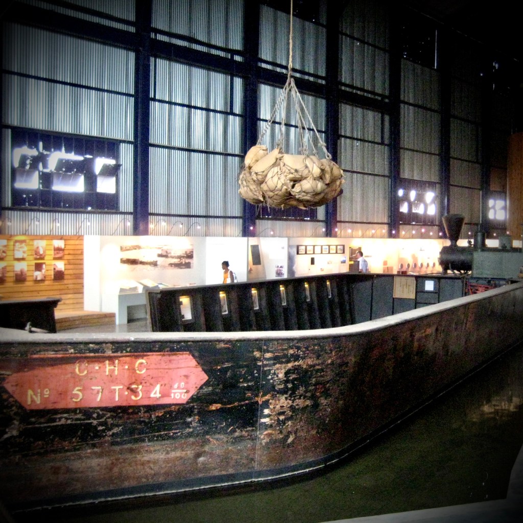 Schnell ist Sparky geparkt und es geht zu Fuß weiter. Entlang der Caudan Waterfront schlendern wir Richtung „Blue Penny Museum“. Die Promenade ist geschmückt mit weihnachtlichen Figuren. Vom Dach des „Le Caudan Waterfront“ Einkaufszentrums baumelt ein überdimensionaler roter Nikolaus und davor am Geländer des Hafens steht ein geschmückter Weihnachtsbaum.