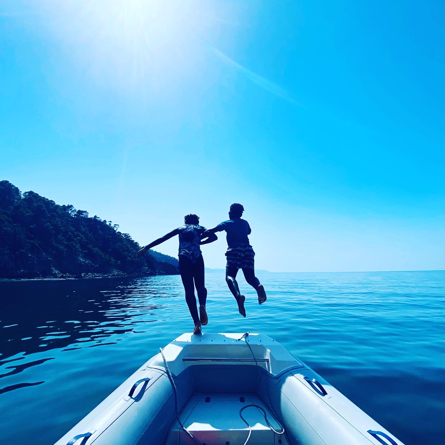 Einmal im Juni haben wir das Amani Spa entdeckt. Im kleinen Supermarkt lag ein vielversprechender Flyer aus. Wir, beide Familien mit Afrika Hintergrund, sind sofort aufmerksam geworden, weil der Baustil einem afrikanischen LuxusZeltCamp ähnelte. Also sind wir dort nach einem Strandtag einfach mal vorbeigefahren. Empfangen wurden wir von einer super sympathischen Familie, ebenfalls mit afrikanischem Hintergrund. Sofort war eine Verbindung zu spüren. Sie kamen vor vielen Jahren über Umwege aus Simbabwe nach Alonissos und haben diese besondere Unterkunft mit Wellnessbereich aufgebaut. Und das Zelt, welches uns sofort auf dem Flyer aufgefallen ist, beherbergt den Spa Bereich. Traumhaft schön. Auch die Kinder waren wie magisch von diesem Ort angezogen und schockverliebt. Da wir damals in der absoluten Vorsaison auf der Insel waren, konnten wir uns auf einen Deal einigen, dass wir den Tag zu acht dort verbringen durften. Der Infinity Pool war Magnet der Kinder. Frühstück gab es unter einem Olivenbaum mit Meerblick. Wir haben uns nacheinander im Spa verwöhnen lassen und sind am frühen Abend nach einem letzten Sundowner wieder nach Patitiri gefahren. Da uns der Tag so verzaubert hat, haben wir an einem anderen Abend dann noch ein Abendessen auf der „Lodge“ gebucht. Aber diese Aktion war mit Kindern wirklich nur nach Absprache und in der Vorsaison möglich.