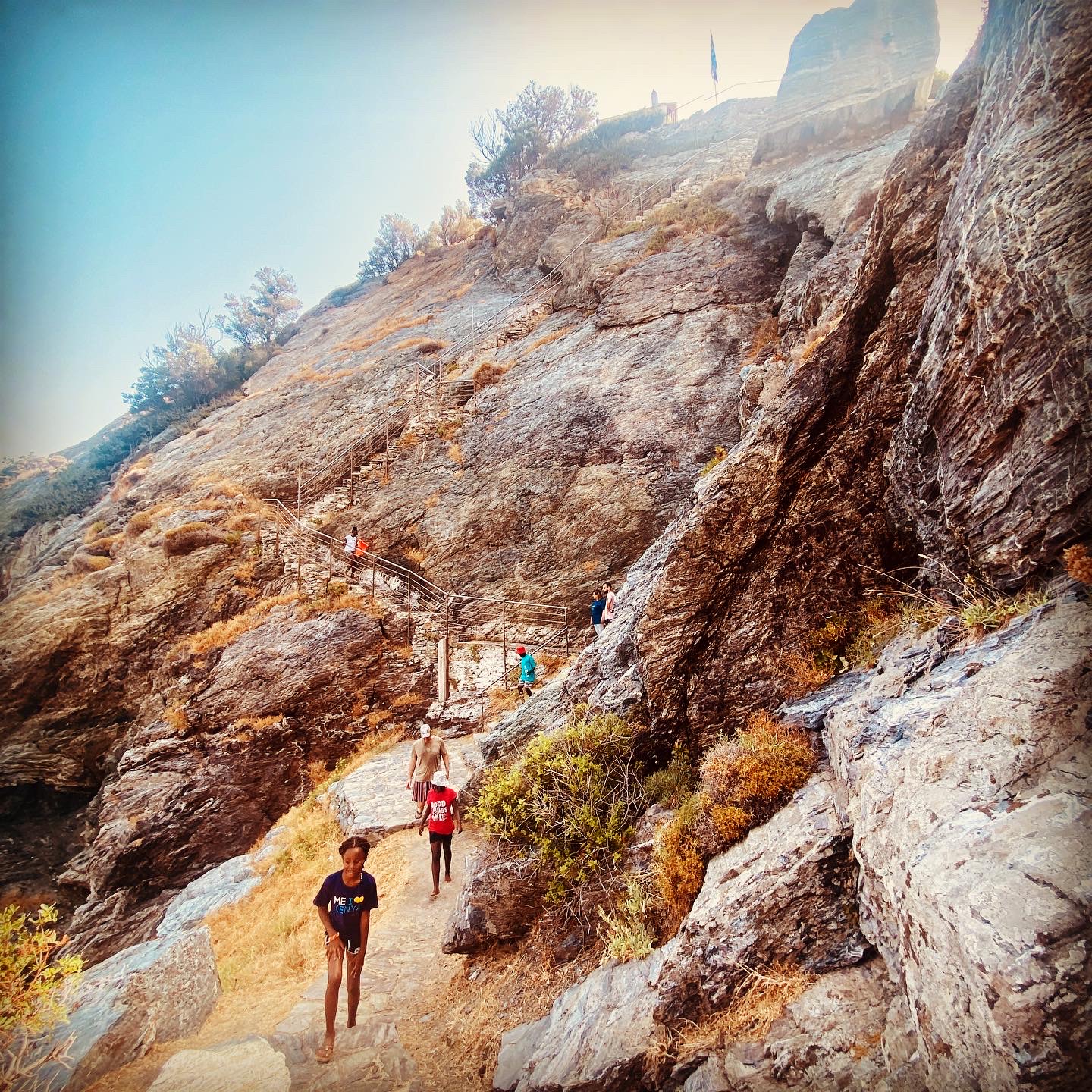 In diesem Jahr haben wir uns ein Boot mit Kapitän gemietet und sind auf die Nachbarinsel Skopolos gefahren. Skopolos ist definitiv die bekanntere Insel. Nur etwa 4 km entfernt. Hier wurden die Mamma Mia Filme gedreht. Ein absolutes Muss von unserer Familie vor jeder Reise nach Alonissos: Einmal beide Teile Mamma Mia anschauen. Somit wollten wir unbedingt die Kirche auf dem Berg besuchen. Unser alter Seebär Kapitän wusste gleich Bescheid, allerdings gab es keine Anlegemöglichkeit für das Boot…. Er fuhr so nah wie möglich an den Strand heran und wir mussten dann, sozusagen über Bord springen. Schuhe in der Hand in die Luft gestreckt. Der Aufstieg war nicht ohne…. Zum Glück waren wir früh genug vor Ort, so dass die steile Treppe empor der Felswand noch im Schatten lag. Gut durchgeschwitzt kamen wir oben an und wurden von einem atemberaubenden Ausblick empfangen und von der Kirche etwas enttäuscht. Denn es sah nichts hier oben so aus, wie im Film. Dennoch war die kleine griechisch-orthodoxe Kirche wunderschön. Aber das hatten wir uns alle etwas anders vorgestellt. Um ehrlich zu sein: Keiner von uns hatte sich vorher weiter über mehr Details zu den Drehorten oder ähnlichem informiert. Der Ausblick hat alles wettgemacht.