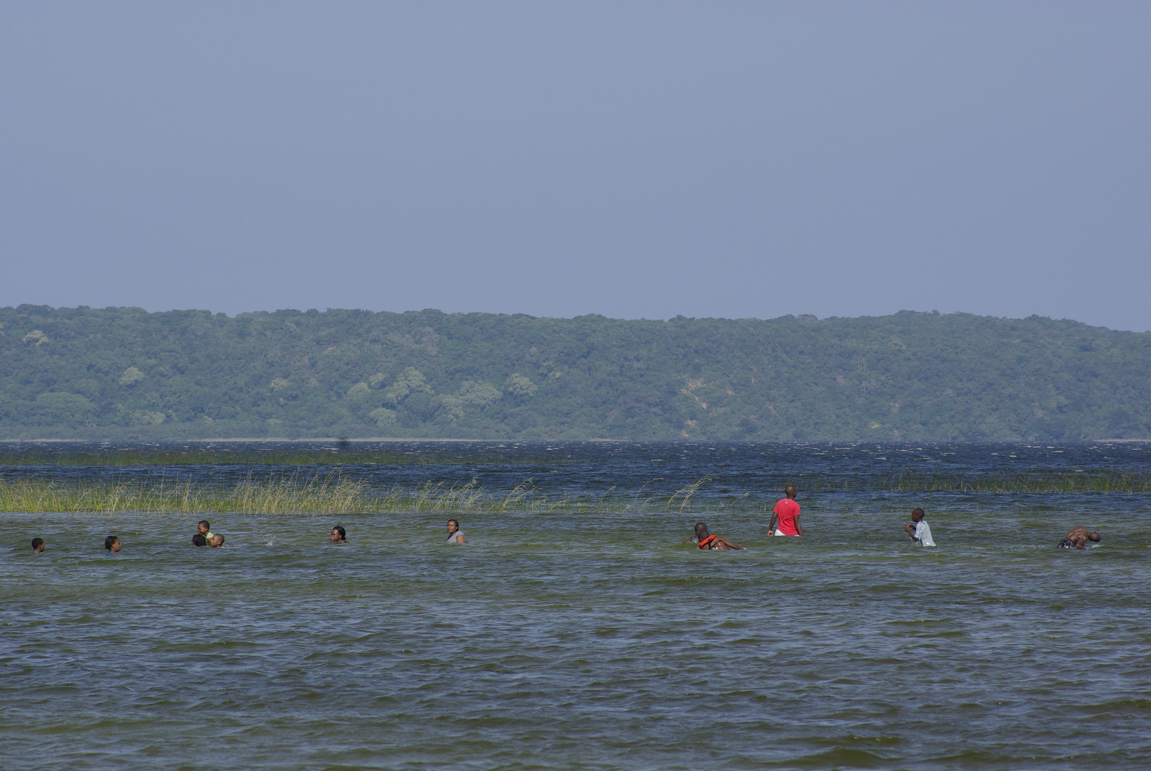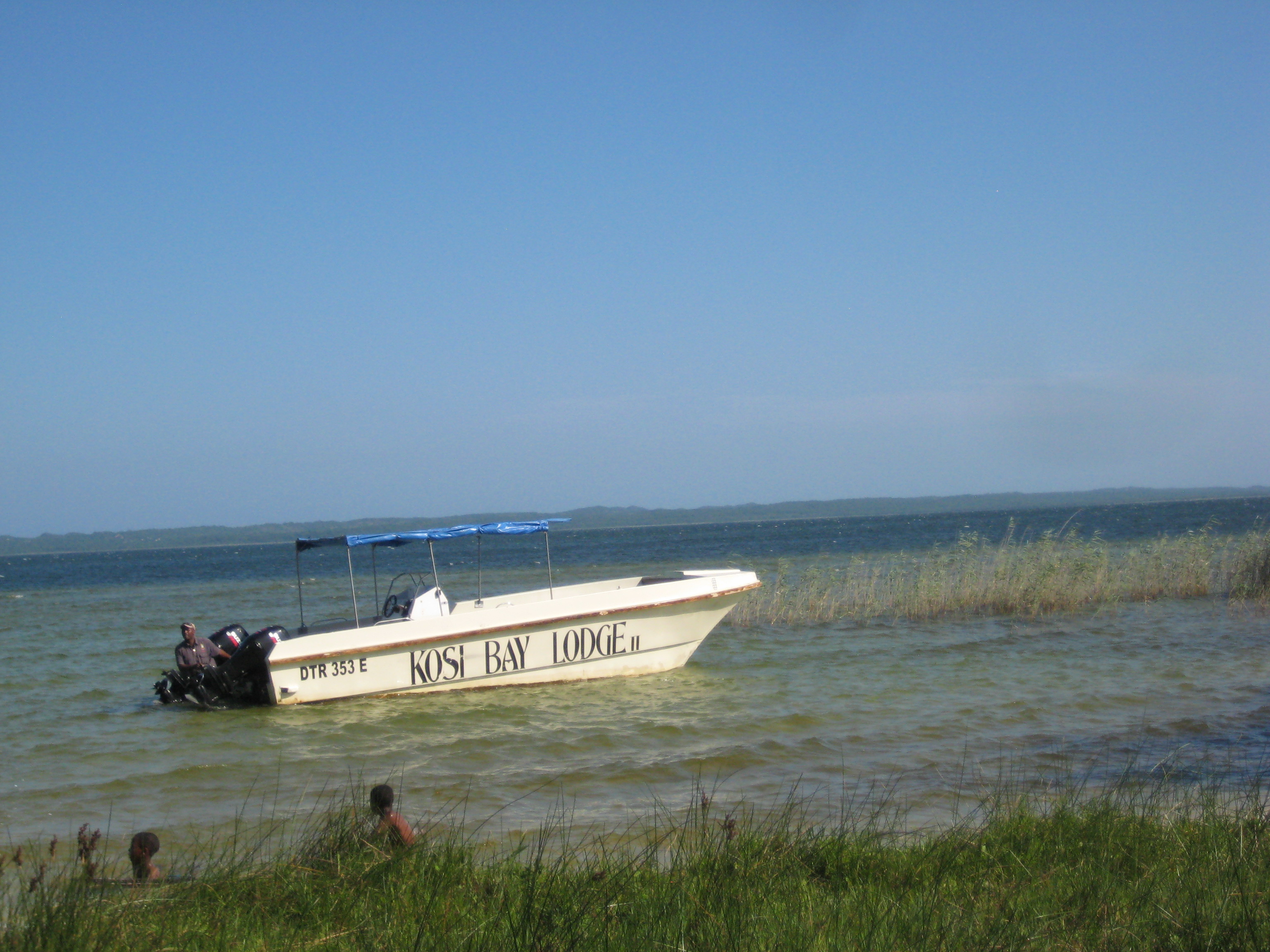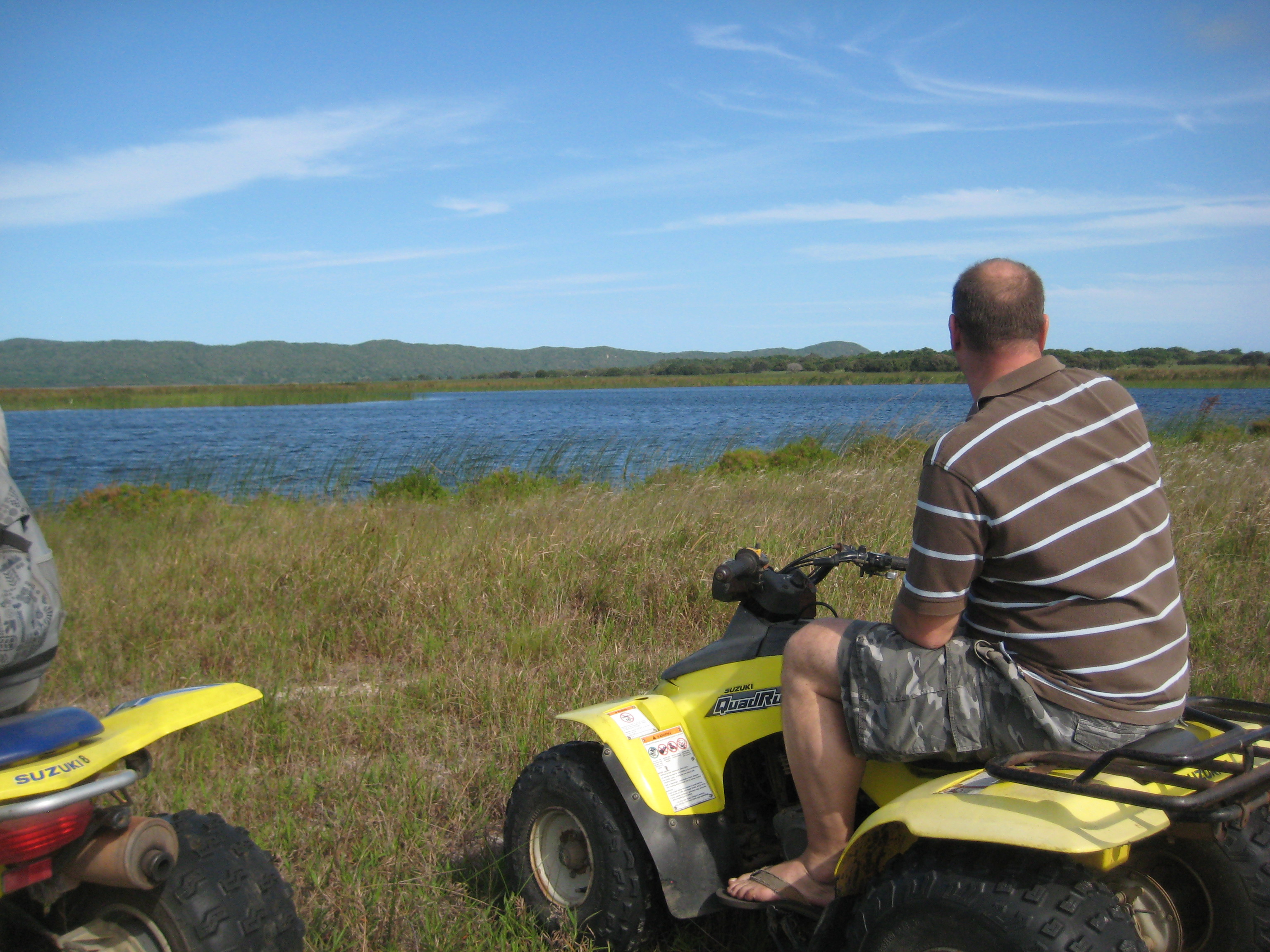 Wir müssen noch ein letztes Stück auf geteerter Straße fahren, bevor wir unsere Unterkunft, die Sodwana Bay Lodge, erreichen. Sodwana Bay ist bekannt für seine Tauchgründe im Indischen Ozean. Aber wir bleiben an Land. Mit Etienne, unserem Quad-Bike-Führer, begeben wir uns erneut auf wilde Fahrt über Sandpisten, weit abgeschieden von der Zivilisation. Mit ihm fahren wir durch unberührte Natur über Hinterwege erneut an das Ufer des Lake Sibhaya. Etienne ist erst seit sechs Monaten hier. Er ist Priester und will hier eine Gemeinde aufbauen. „Ich bin Gottes Ruf gefolgt“, erzählt er uns. Um momentan sein Leben zu finanzieren, begleitet er auf geführten Quad Touren die Reisenden zu Zielen in der Region. Mit ihm entdecken wir in einer Seitenbucht des Sees wieder ein Nilpferd. Über weite, ebene Sandpisten fahren wir dahin, den frischen Fahrtwind im Gesicht. Hin und wieder begegnen uns Kuhherden, sonst sehen wir keine Menschenseele. Am Ufer angekommen, ist Etienne der erste, der in die Fluten springt. Den Staub der Tour herunterwaschen und das kühlende Nass genießen. Wir folgen ihm sofort, aber erst nachdem wir dann doch noch einmal die Krokodil- und Nilpferdfrage geklärt haben. Etienne bestätigt uns mehrmals, dass das Wasser absolut rein ist. So rein, dass er auch gleich seine Wasserflasche mit Seewasser füllt. Wir bleiben dann doch lieber bei unserem Mineralwasser. Auf der einen Seite des Ufers erheben sich grünbewachsene Berge, denken wir. Etienne erklärt uns, dass dies alles bewachsene Sanddünen sind und direkt dahinter, ganz nah, der indische Ozean liegt. Die Dünen sind bis zu 168 m hoch, erzählt er.