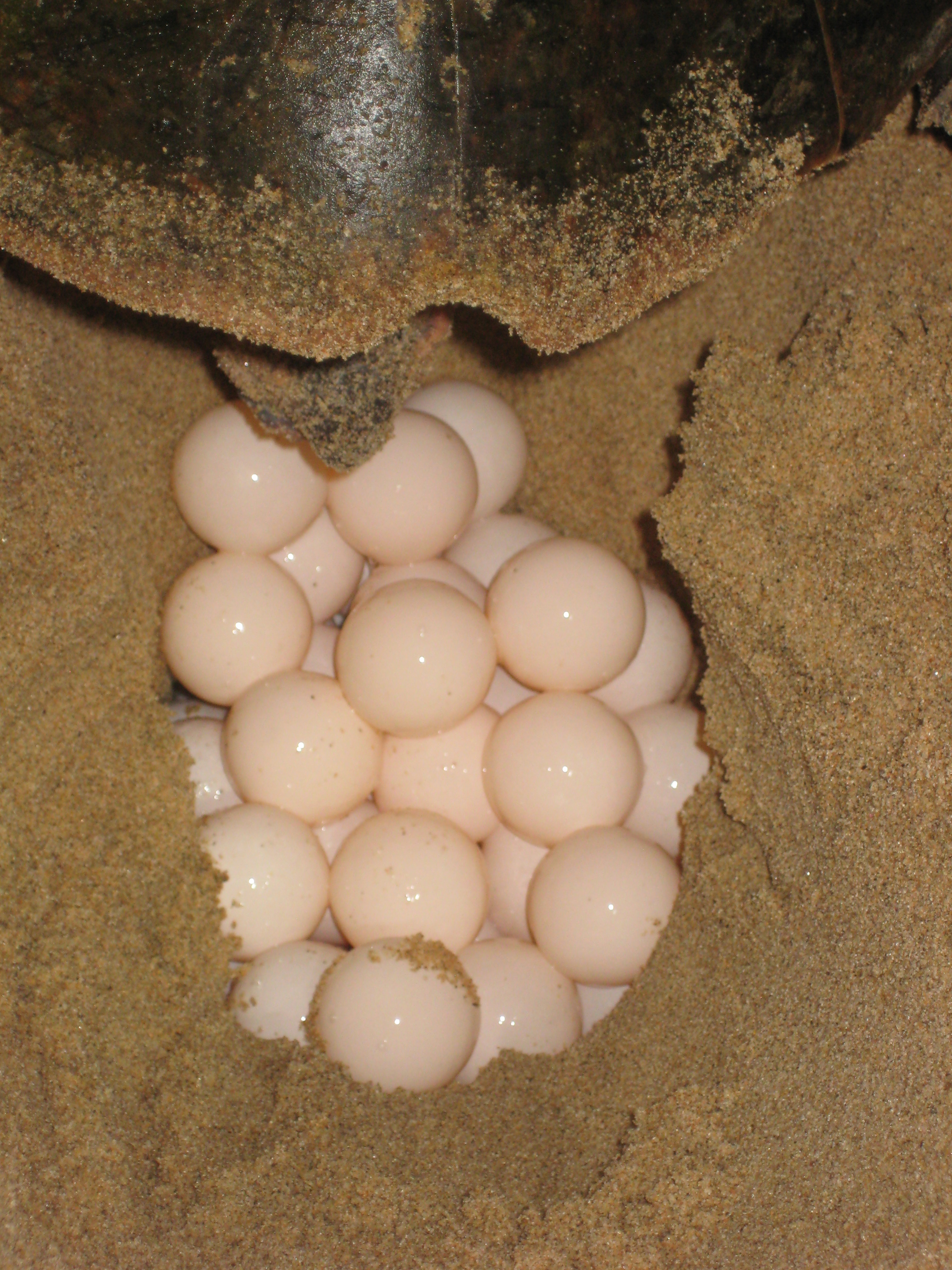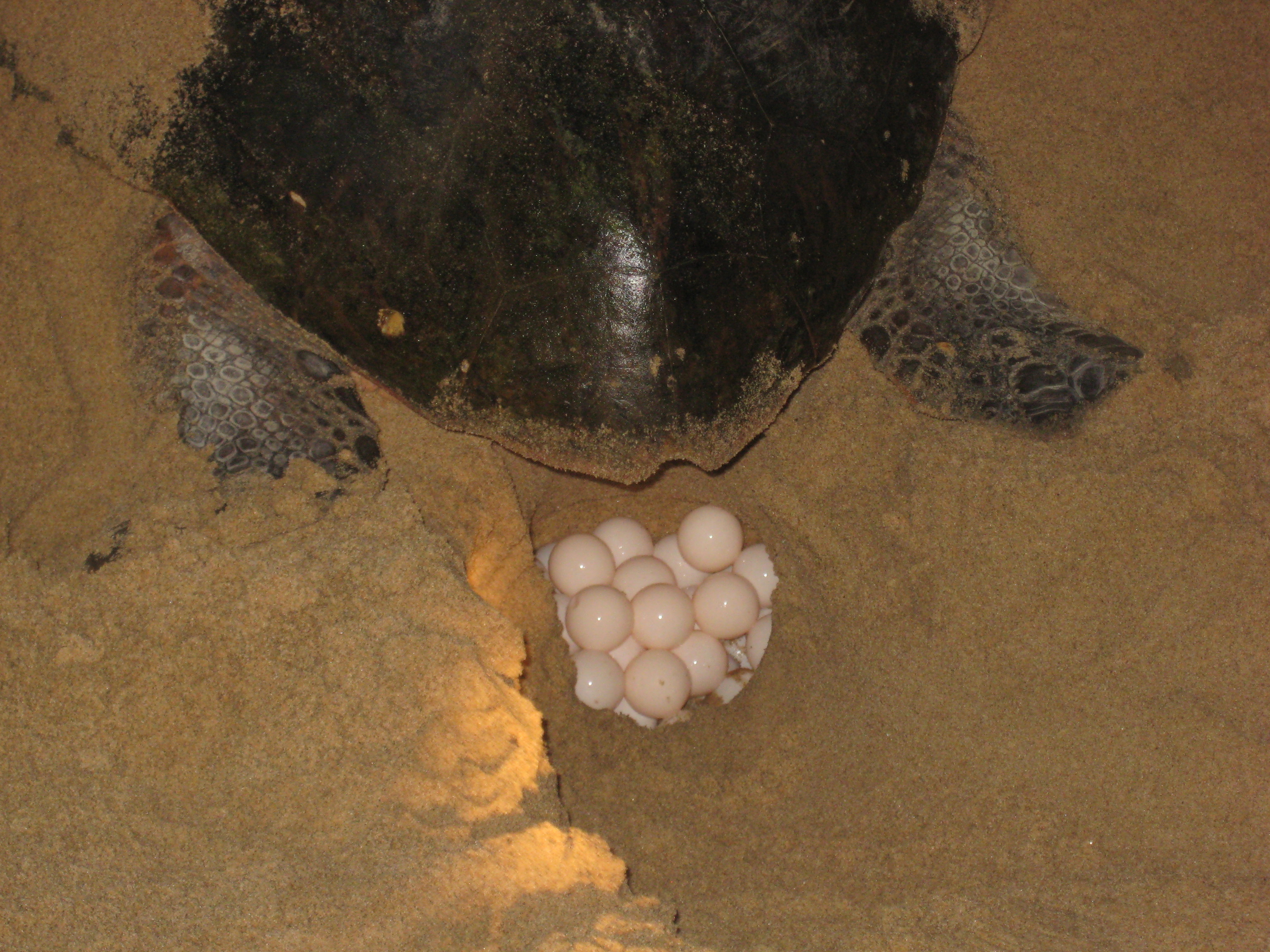 Nach einiger Zeit verläßt Jabulani das Auto und schleicht sich an das Weibchen heran. Ganz leise, ganz langsam. Er will sicher sein, dass sie bereits mit dem Buddeln fertig ist und möchte herausfinden, in welche Richtung der Kopf zeigt. Wir dürfen uns dann zusammen mit ihm von hinten der Schildkröte nähern. Und dann geht es auch schon los, die Loggerhead Schildkröte (unechte Karettschildkröte) legt los. Ein Ei nach dem anderen fällt in die Grube. Die Eier sind rund und haben die Größe von Tischtennisbällen. Immer drei, vier fallen schnell hintereinander. Wir zählen 84 Eier. Jabulani erklärt uns, dass die Loggerhead Schildkröte generell um die 80 Eier legt. Da die vorherige Eiablage nach acht Eiern abgebrochen wurde, ist dies ein klares Zeichen, dass sich das Weibchen gestört gefühlt hat, für mich.