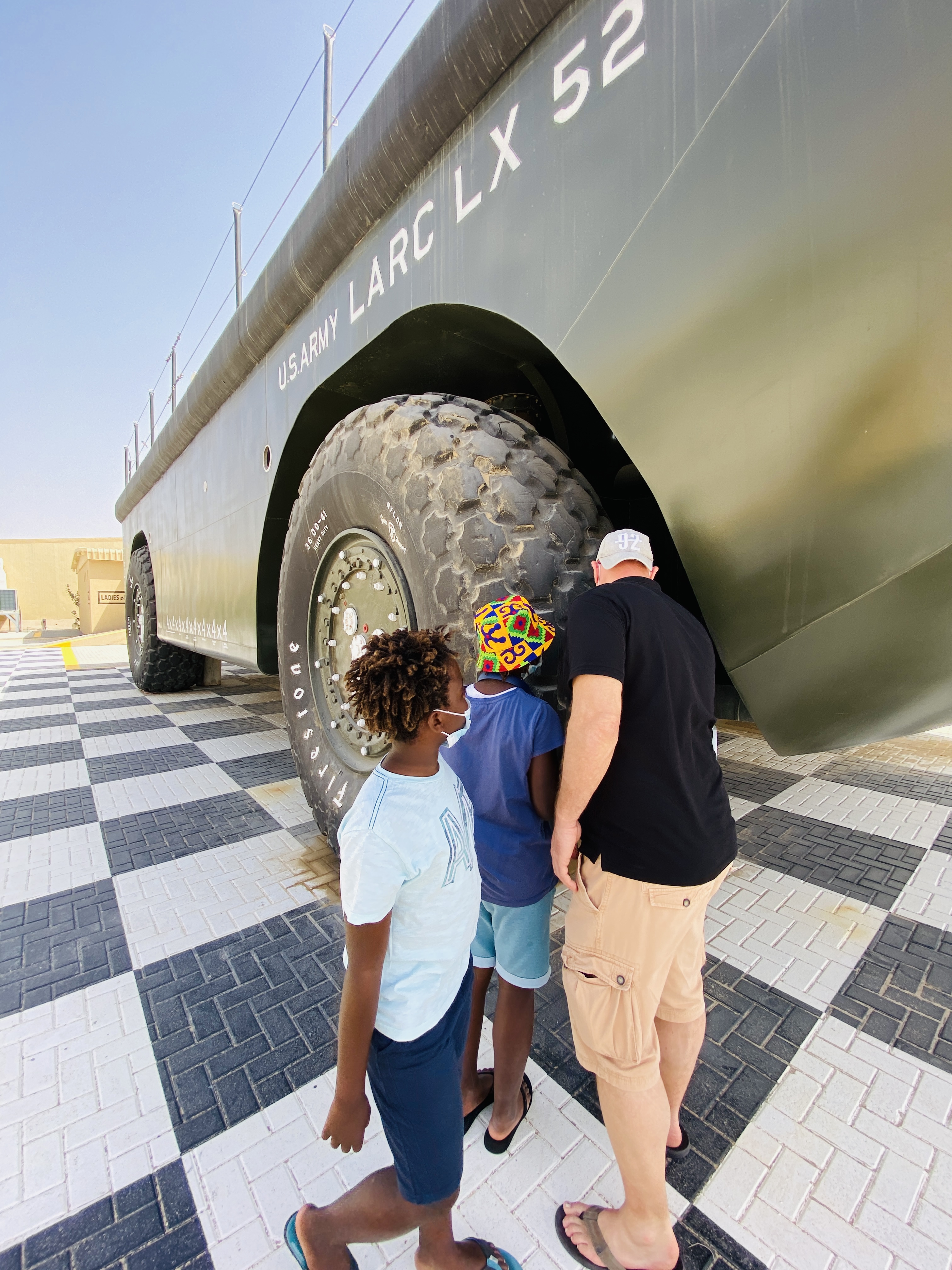 Im Außenbereich, bei einem Hallenwechsel, steht noch ein RIESIGES Amphibienfahrzeug, dass die Kinder besonders fasziniert.