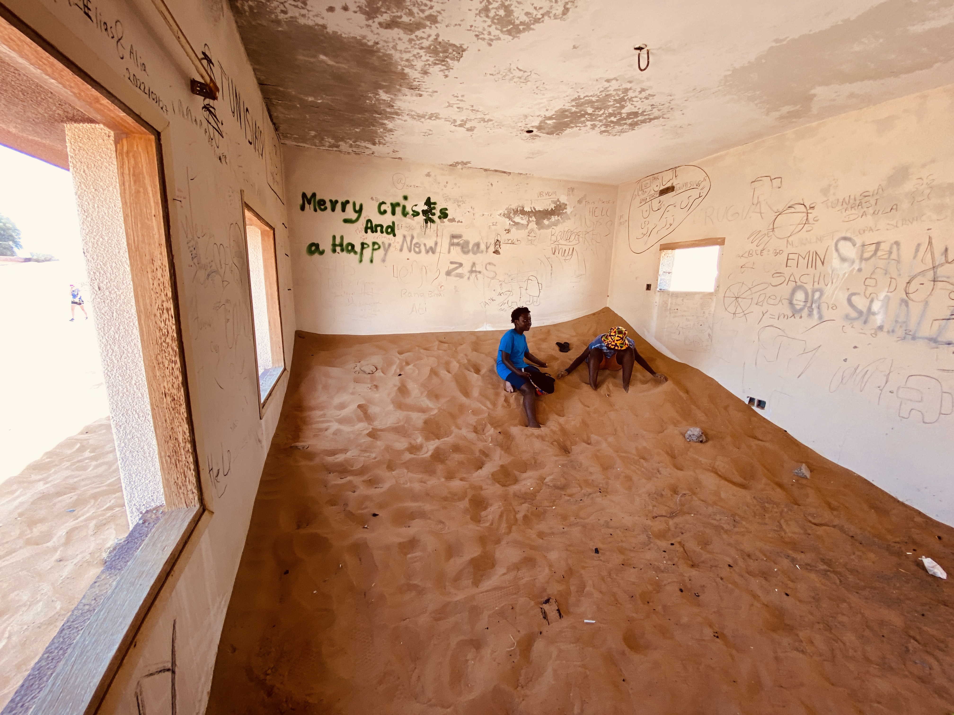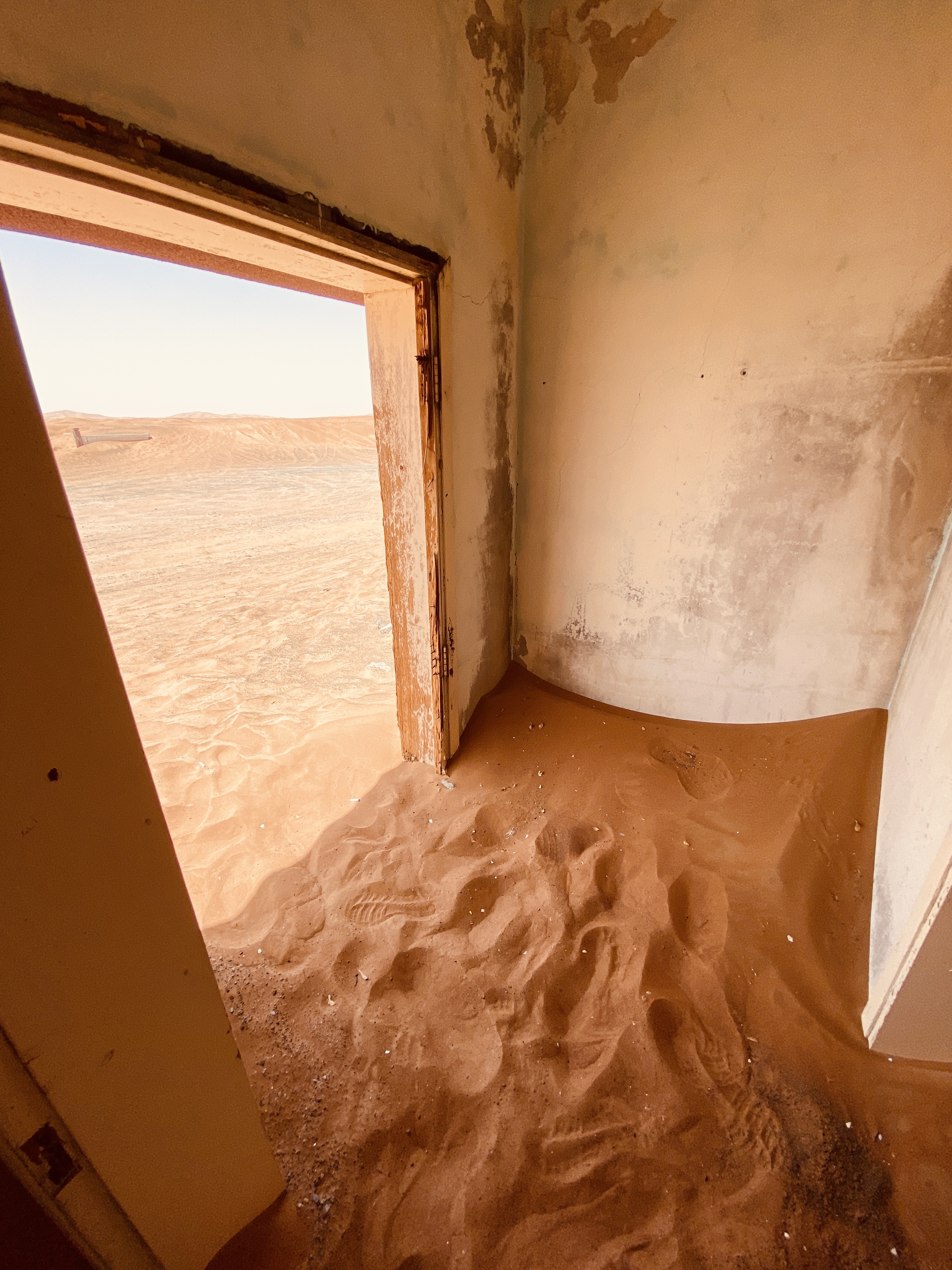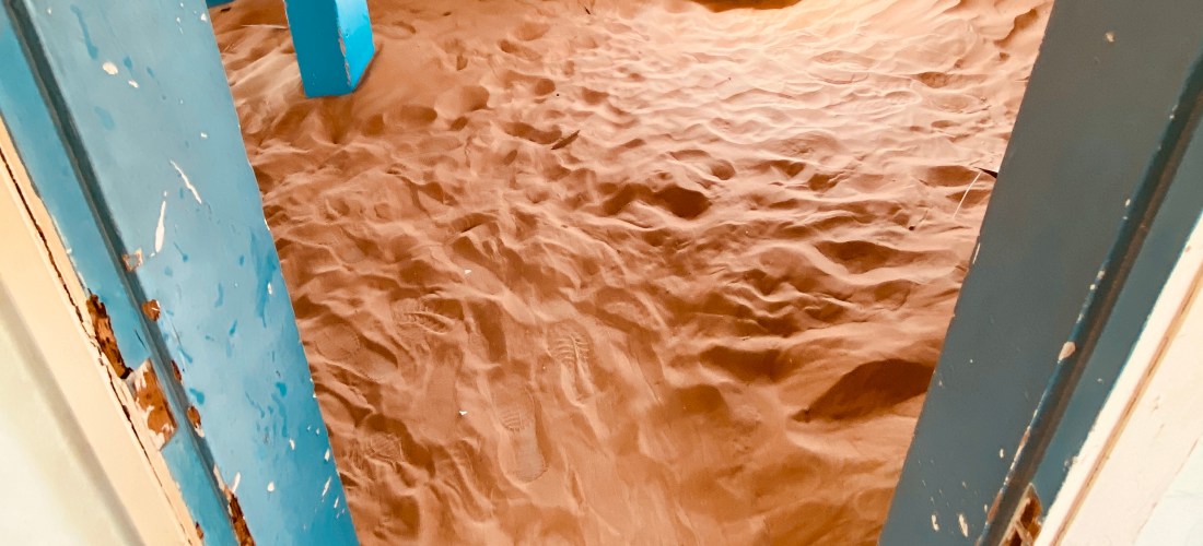 Man kann etwas entfernt parken und läuft dann vielleicht 100 m zum „Eingang“. Auf diesen 100 m mittags um 12 Uhr brennen mir die Zehen. Leider habe ich nicht meine geschlossenen Schuhe angezogen, sondern bin mutig in meinen Flip Flops los. Besonders mein dicker Zeh ist überhaupt nicht begeistert und schmerz wirklich, wenn der heiße Sand sich darunter klemmt. Wow… Aber ich bleibe tapfer und laufe sehr bedächtig und vorsichtig, aber trotzdem schnellen Schrittes von Schatten zu Schatten. Ich denke, es sieht super lustig aus… Die Häuseransammlung, Town ist fast schon übertrieben, besteht nur aus ein paar wenigen Häusern, die sich einmal anscheinend entlang einer kurzen Straße erstreckt haben. Vielleicht aus den 60er oder 70er Jahren. In manchen sind die Wände bunt angemalt, in manchen leider auch mit schlechten Sprüchen oder Kritzeleien verunstaltet. Aber es ist uns bleibt super spannend in solch verlassenen Gegenden auf Erkundung zu gehen. Manche Decken sind reich verziert und man kann diese gar berühren, denn der Sand dringt weiter und weiter in die Häuser ein und die Natur übernimmt die Siedlung. Die Kinder klettern in einem Zimmer, dass fast vollkommen mit Sand gefüllt ist, ins Dunkel hinein. Irgendwie auch ein bisschen unheimlich.