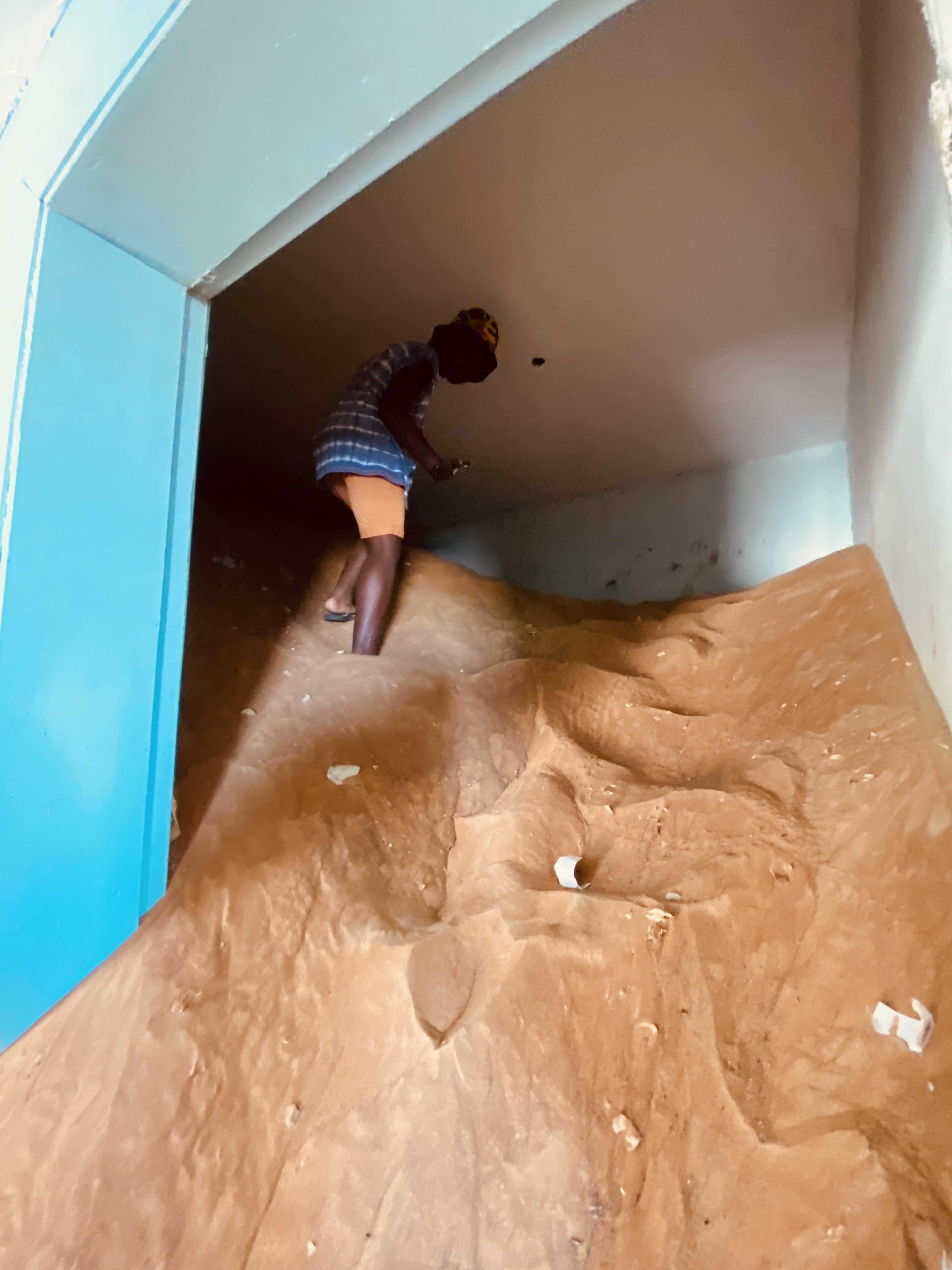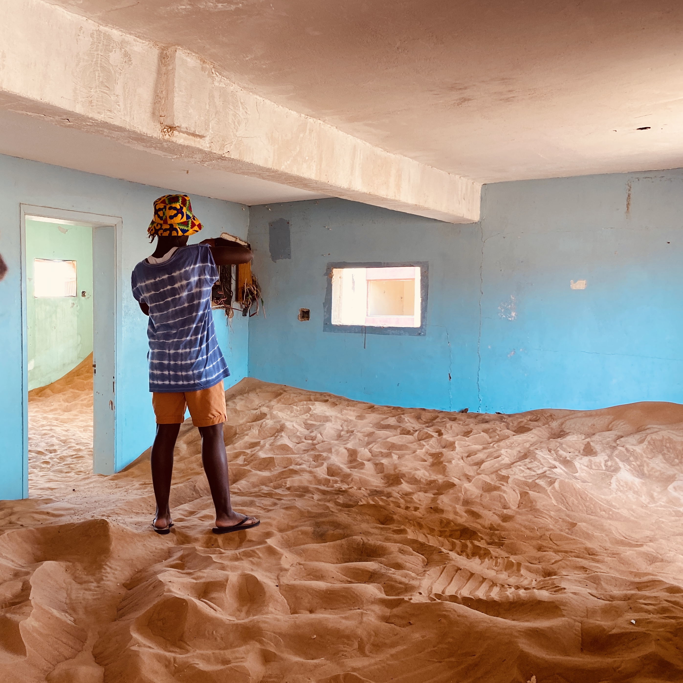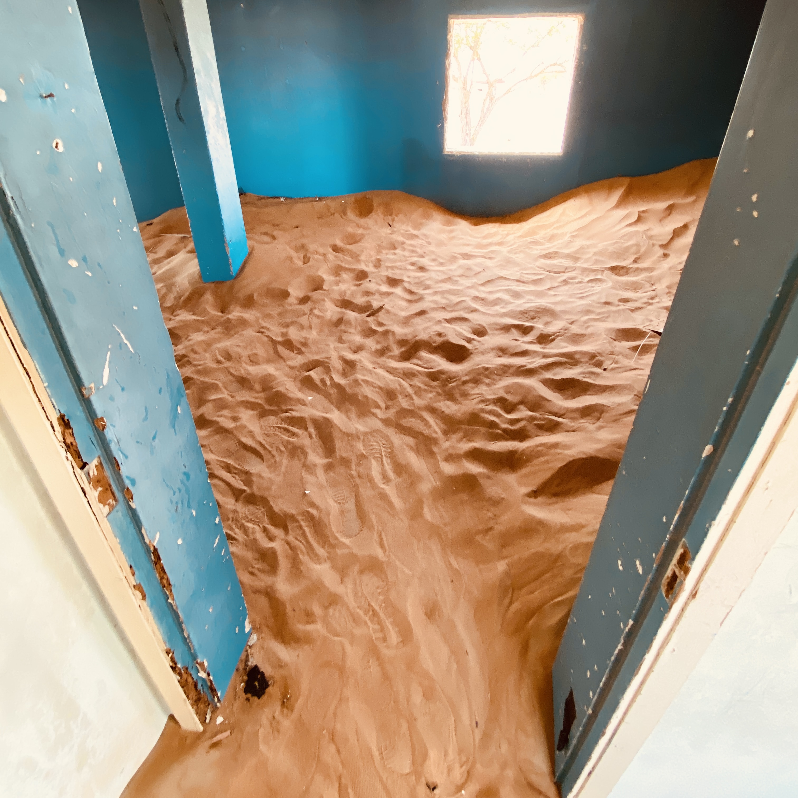 Man kann etwas entfernt parken und läuft dann vielleicht 100 m zum „Eingang“. Auf diesen 100 m mittags um 12 Uhr brennen mir die Zehen. Leider habe ich nicht meine geschlossenen Schuhe angezogen, sondern bin mutig in meinen Flip Flops los. Besonders mein dicker Zeh ist überhaupt nicht begeistert und schmerz wirklich, wenn der heiße Sand sich darunter klemmt. Wow… Aber ich bleibe tapfer und laufe sehr bedächtig und vorsichtig, aber trotzdem schnellen Schrittes von Schatten zu Schatten. Ich denke, es sieht super lustig aus… Die Häuseransammlung, Town ist fast schon übertrieben, besteht nur aus ein paar wenigen Häusern, die sich einmal anscheinend entlang einer kurzen Straße erstreckt haben. Vielleicht aus den 60er oder 70er Jahren. In manchen sind die Wände bunt angemalt, in manchen leider auch mit schlechten Sprüchen oder Kritzeleien verunstaltet. Aber es ist uns bleibt super spannend in solch verlassenen Gegenden auf Erkundung zu gehen. Manche Decken sind reich verziert und man kann diese gar berühren, denn der Sand dringt weiter und weiter in die Häuser ein und die Natur übernimmt die Siedlung. Die Kinder klettern in einem Zimmer, dass fast vollkommen mit Sand gefüllt ist, ins Dunkel hinein. Irgendwie auch ein bisschen unheimlich.