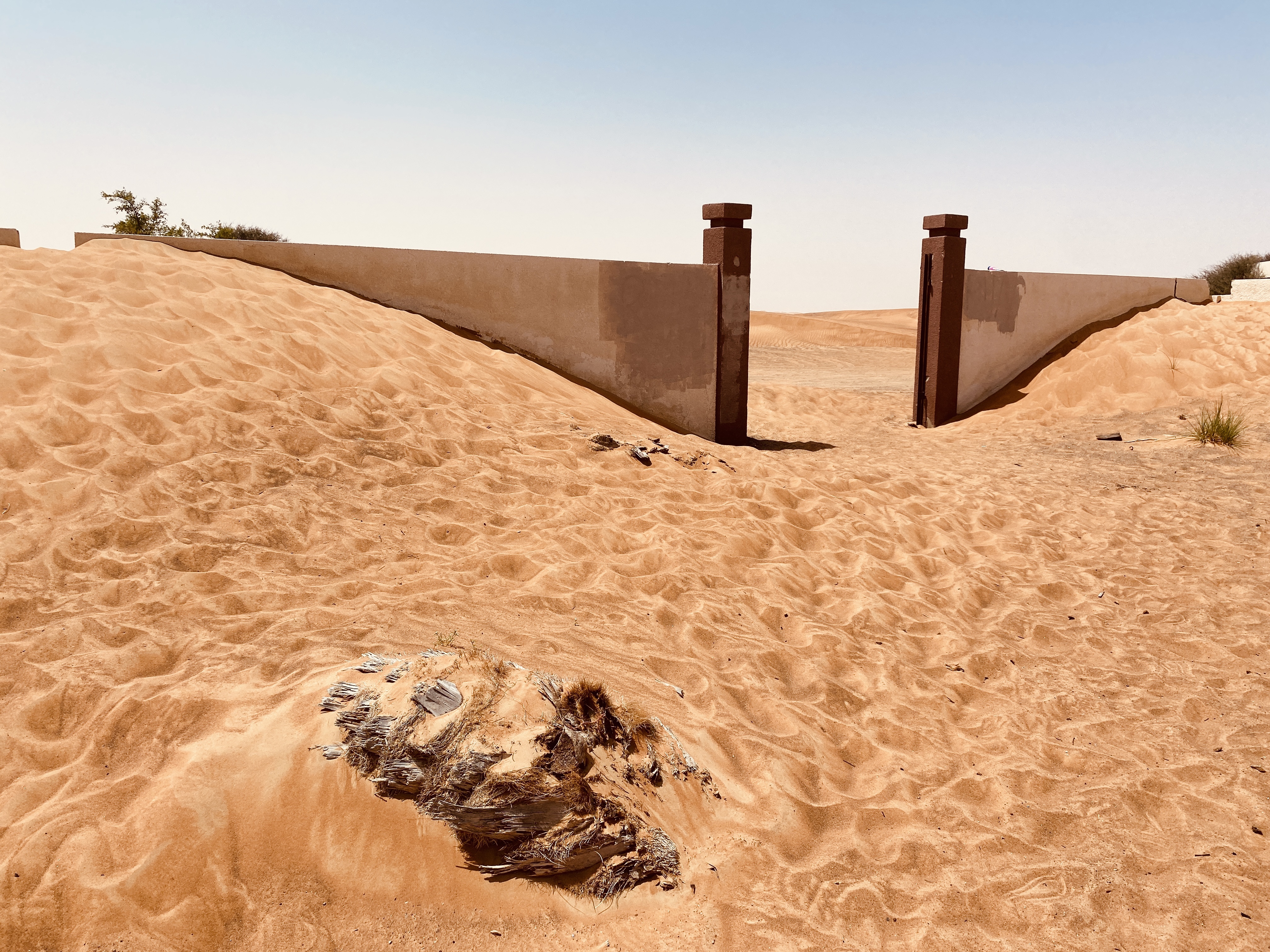 Das Al Madam Ghost Town oder Lost City, nicht weit vom Mysk al Badayer Resort entfernt, ist mit einem normalen PKW zu erreichen. Das Navigationsgerät für uns durch einen Ort. Desto weiter wir eindringen, desto mehr hat man auch hier schon mal das Gefühlt, dass die ein oder andere Ecke schon verlassen ist und der Sand Einzug hält. Der Weg führt dann aber doch wieder aus dem Ort heraus, ein paar Kamele suchen hier etwas Essbares. Nicht mehr weit entfernt können wir schon zwei Autos in der Wüste parken sehen. Dass muss es sein.