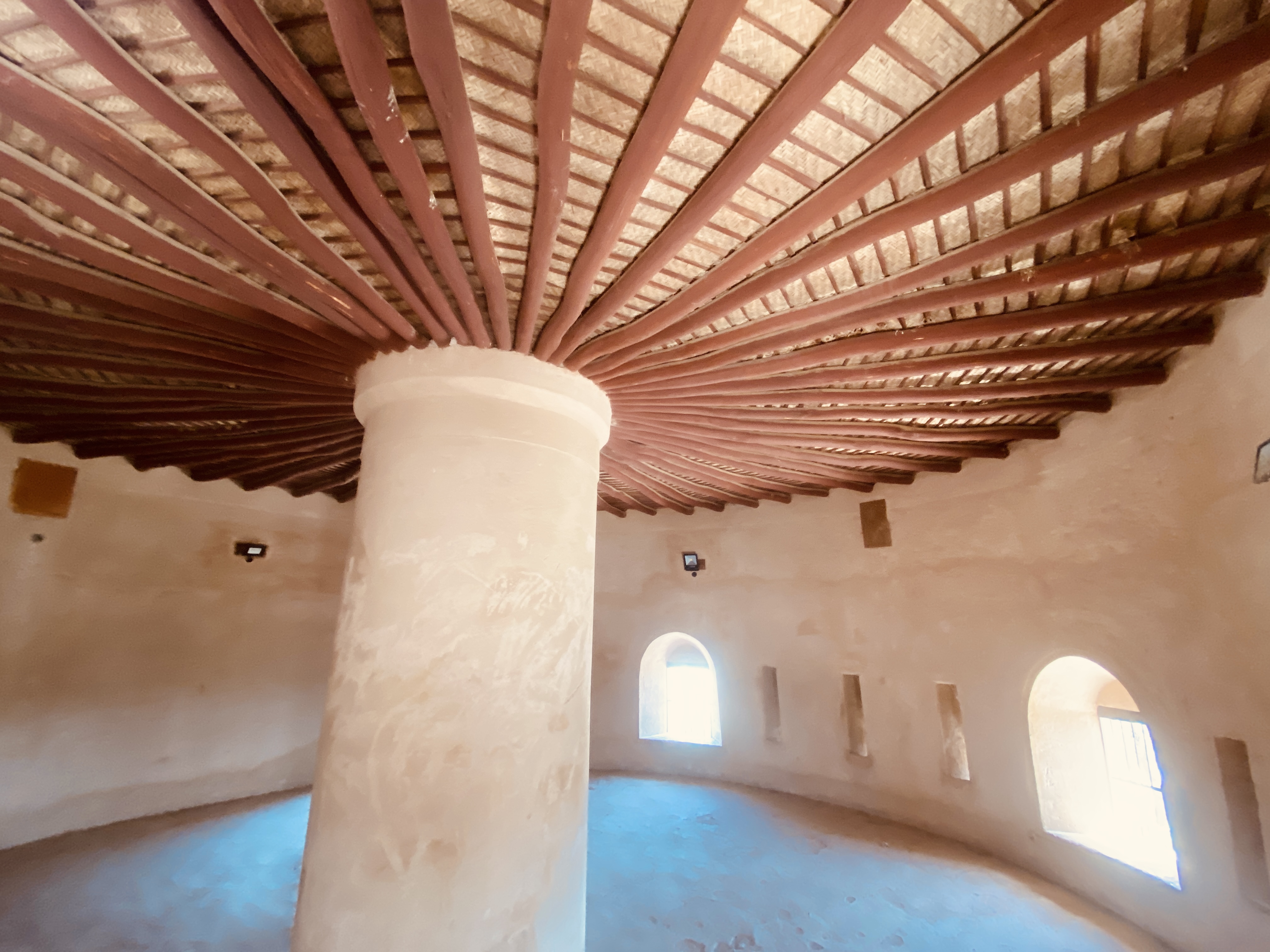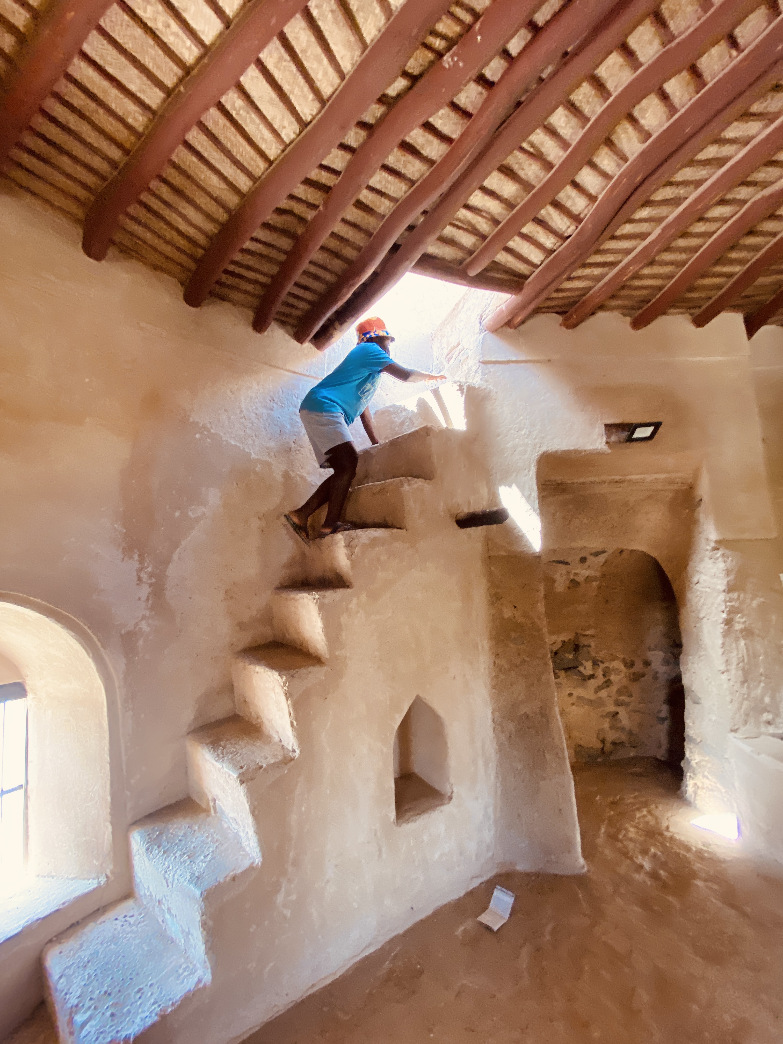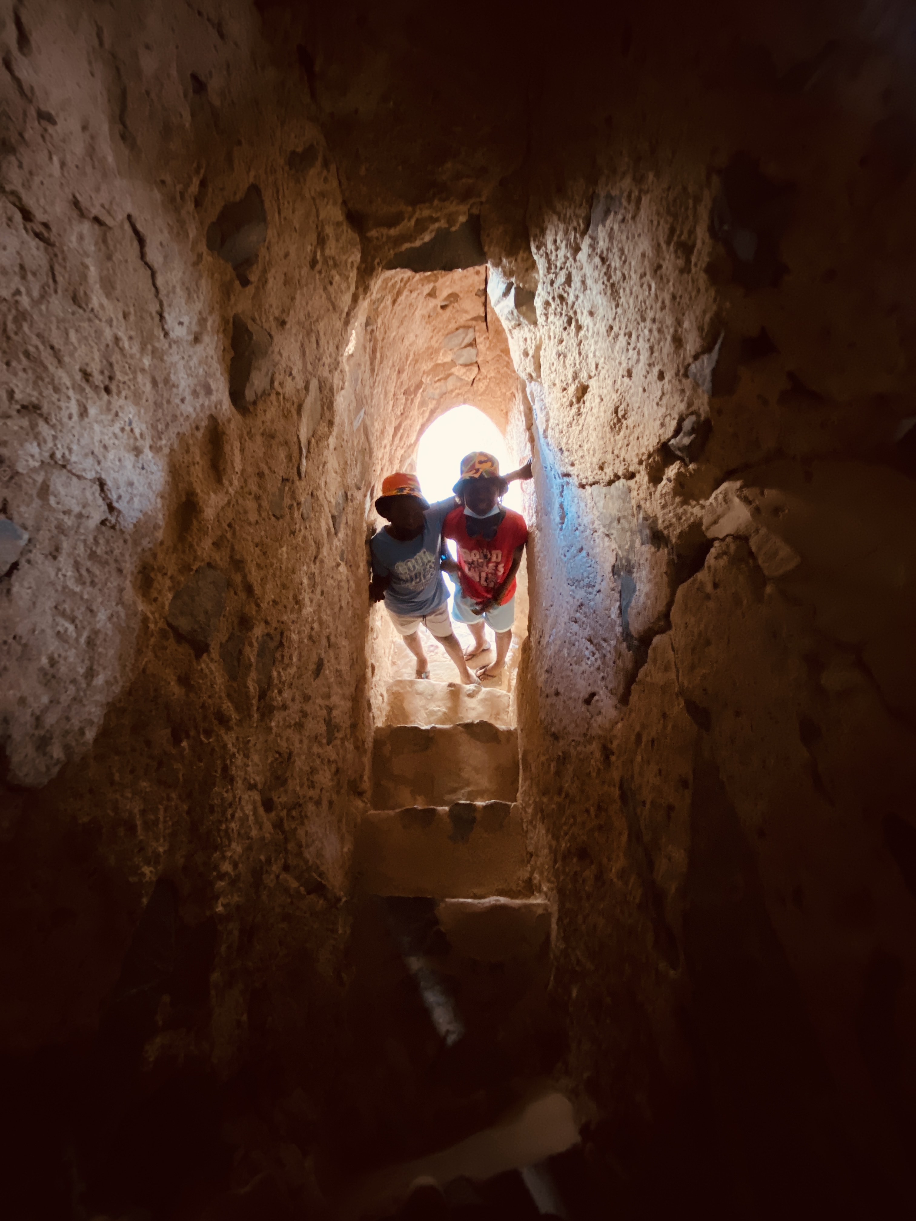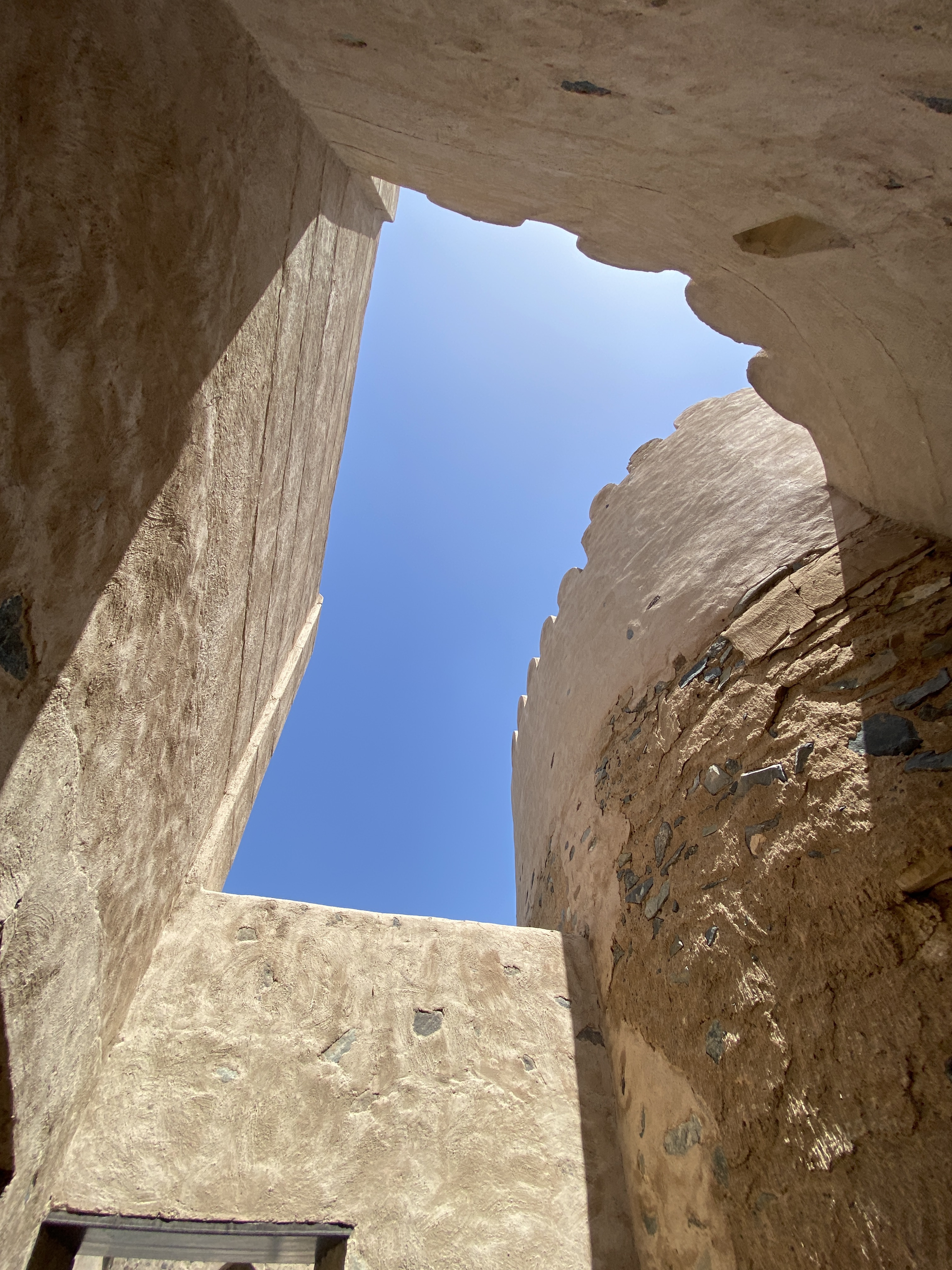 Anschließend fahren wir zum Fujairah Fort. Laut dem kleinen Infoheftchen, welches wir im Museum mitgenommen haben, ist durch Analysen festgestellt worden, dass das Fort zwischen 1500 und 1550 erbaut wurde. Das Fort wurde komplett restauriert und sieht tiptop aus. Wir lassen uns durch die leeren Gänge und Räume treiben. Die Kinder finden es spannend, alle Ecken zu erkunden. Von einem Turmdach hat man einen tollen Rundumblick über die ganze Gegend.