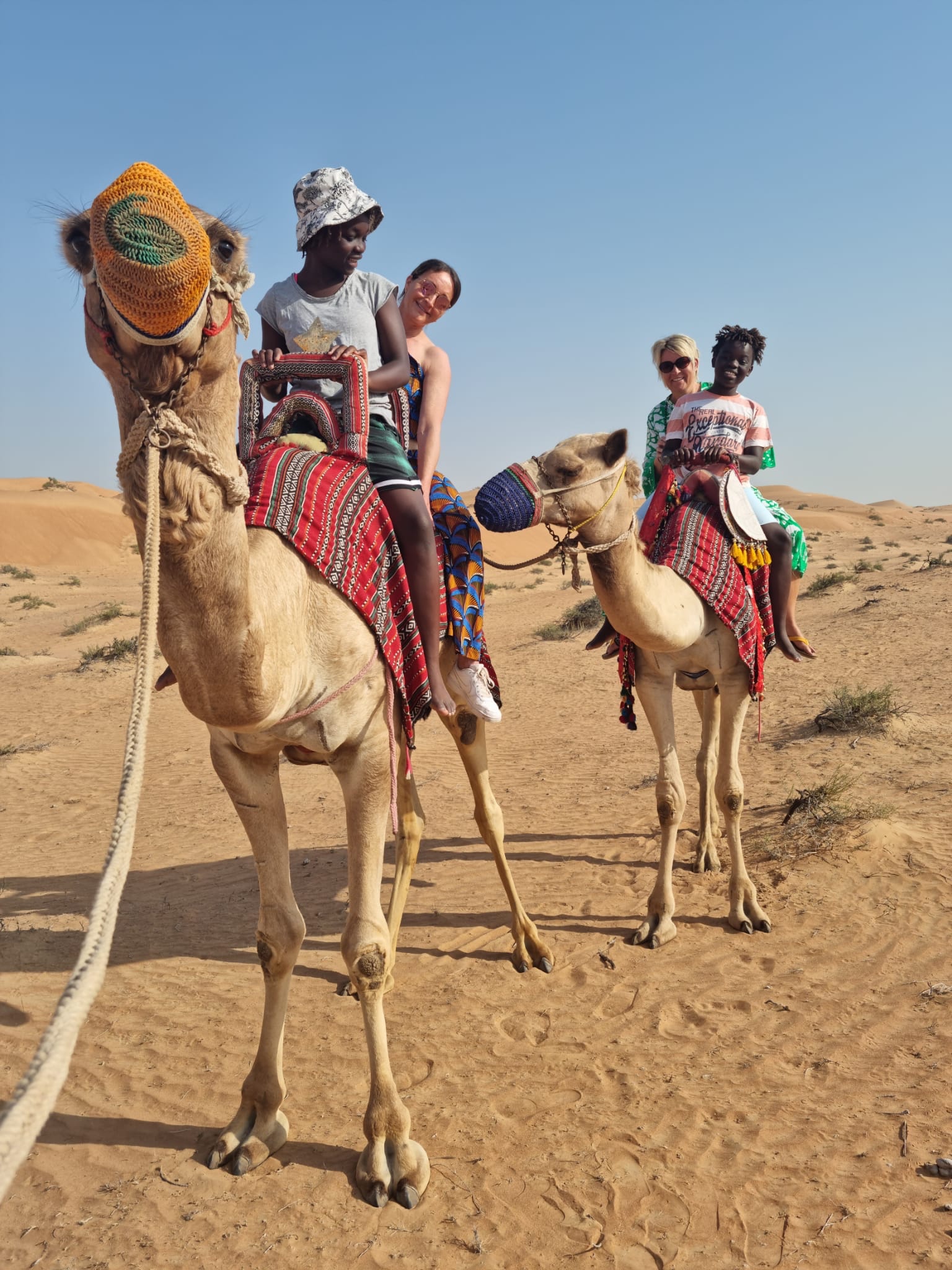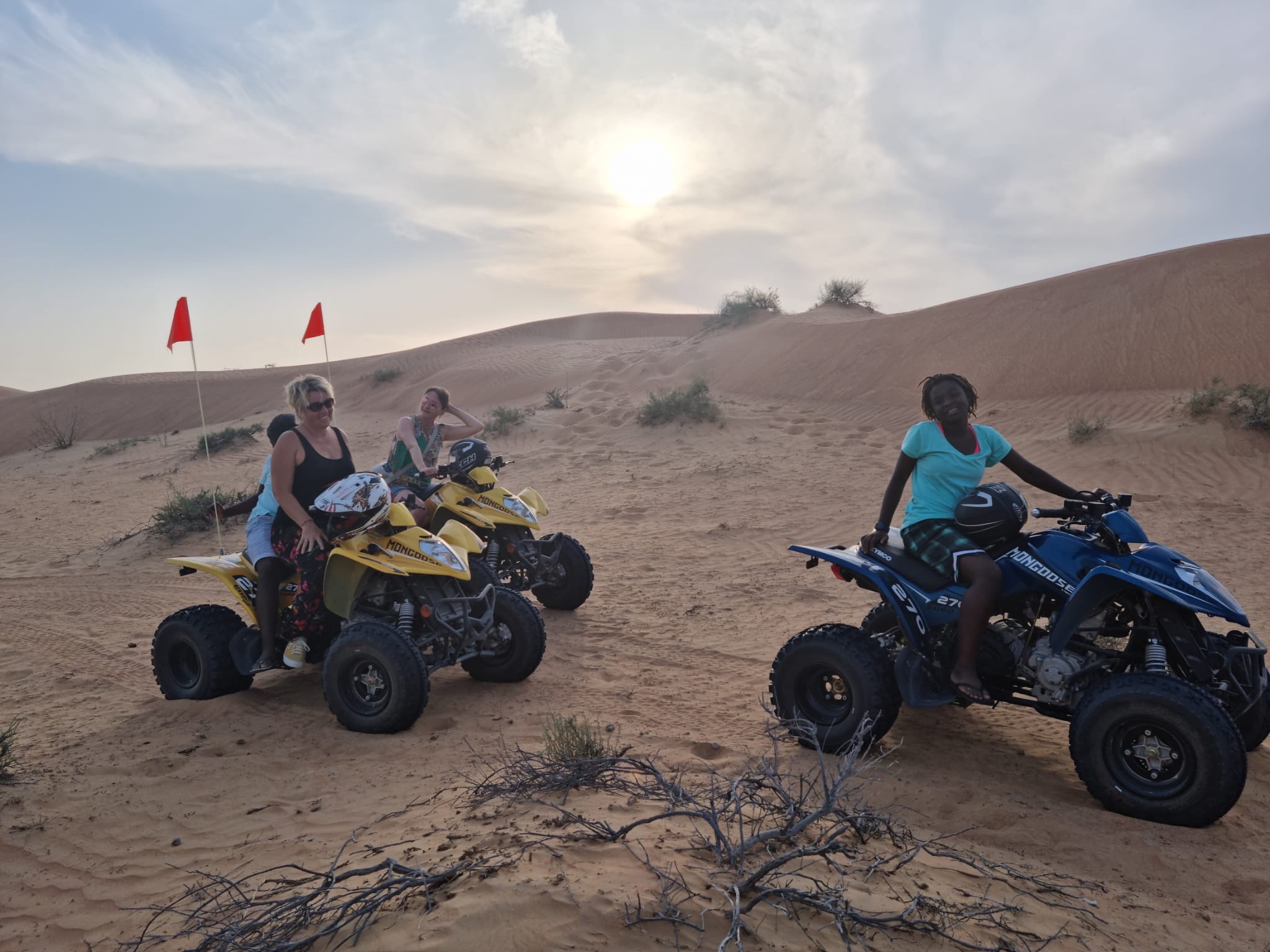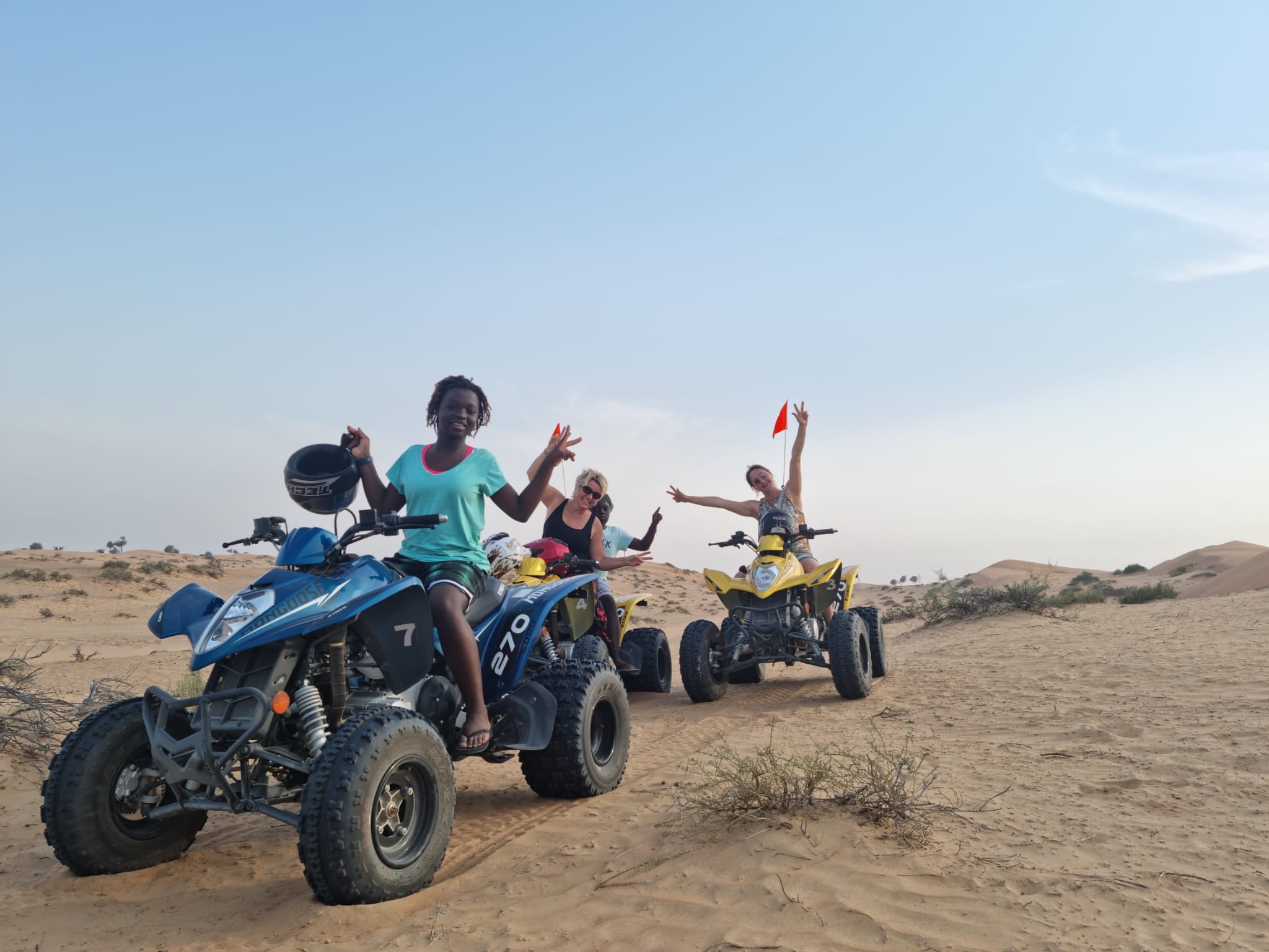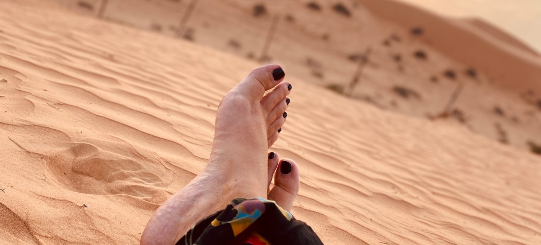 Aber erstmal haben wir am Nachmittag nach Ankunft (Anreise in diesen Wüstencamps oder -hotels meist erst zwischen 15 und 16 Uhr) noch eine Stunde Quadtour durch die Wüste gebucht. Leider werden wir aufgefordert Helme zu tragen, was ich sehr schwer ertragen kann. Das Aufzwängen des Helmes verursacht fast eine Art Platzangst bei mir. Schrecklich. Dann noch die Hitze und der Helm, der auf den Kopf drückt. Kostet mich ganz schön Überwindung, aber sobald der Fahrtwind um den Hals weht, wird es langsam besser. Es ist so wunderschön zu viert mit Guide tiefer und tiefer in die Wüste einzudringen. Man fühlt sich der Wüste noch viel näher. Wenn wir anhalten und eine kleine Fotosession einlegen, herrscht vollkommene Ruhe. Der Kopf darf auch kurz wieder Freiheit genießen – helmfrei. Den Sand unter den Füßen. Ich liebe es.