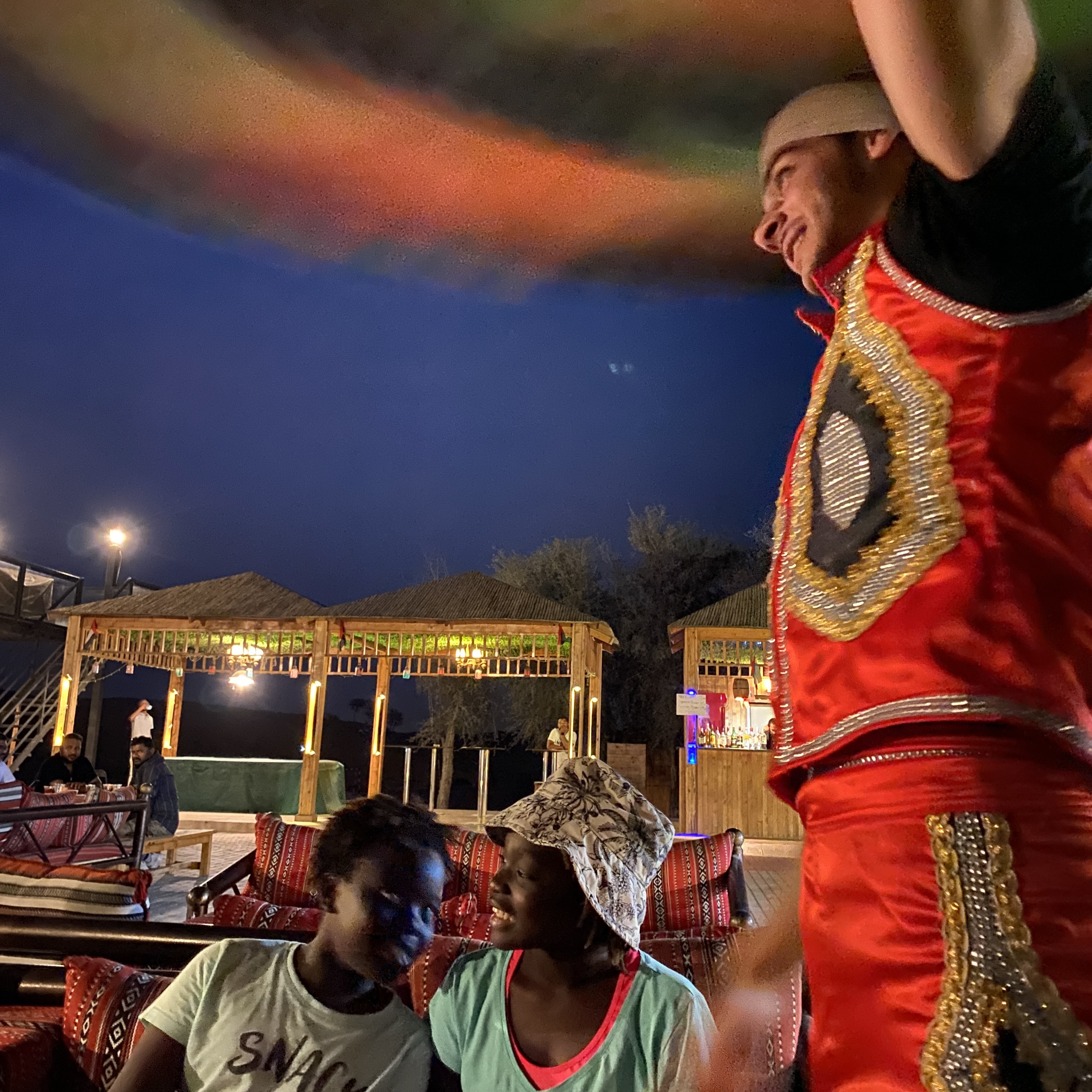 Zur Show und zum Essen sitzen wir ebenfalls auf kleinen, arabischen Sofas. Tolle Atmosphäre und gutes, einfaches Essen. Kühle Getränke und eine immer wiederkehrende Showeinlage (in allen Wüstencamps): Bauchtanz, die Derwische mit ihrem schwindelerregenden Drehtanz und zum absoluten Highlight jedes abends eine Feuershow.