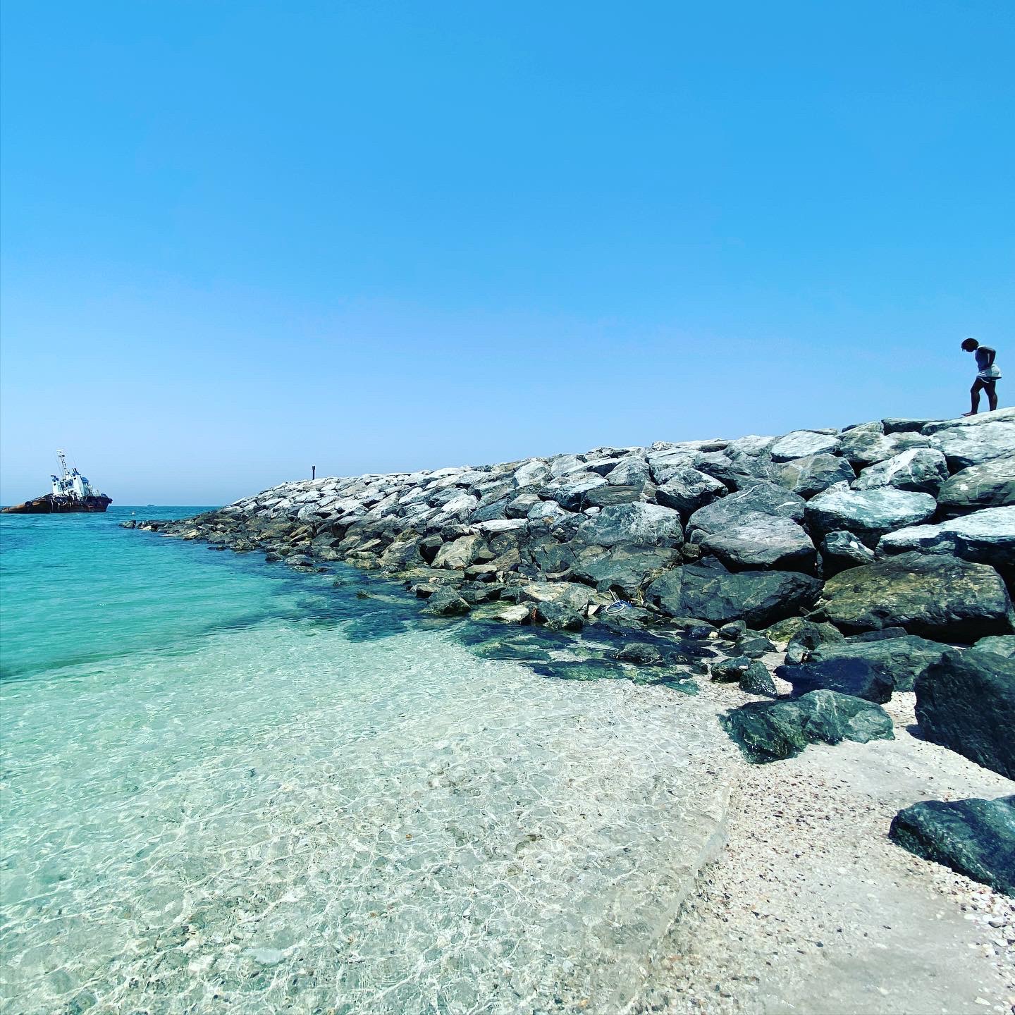 Da die Kinder vom Regenraum in Sharjah eh schon nass sind, beschließen wir noch das Meer zu suchen.