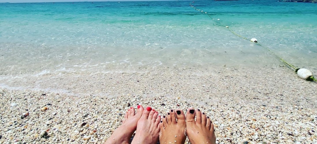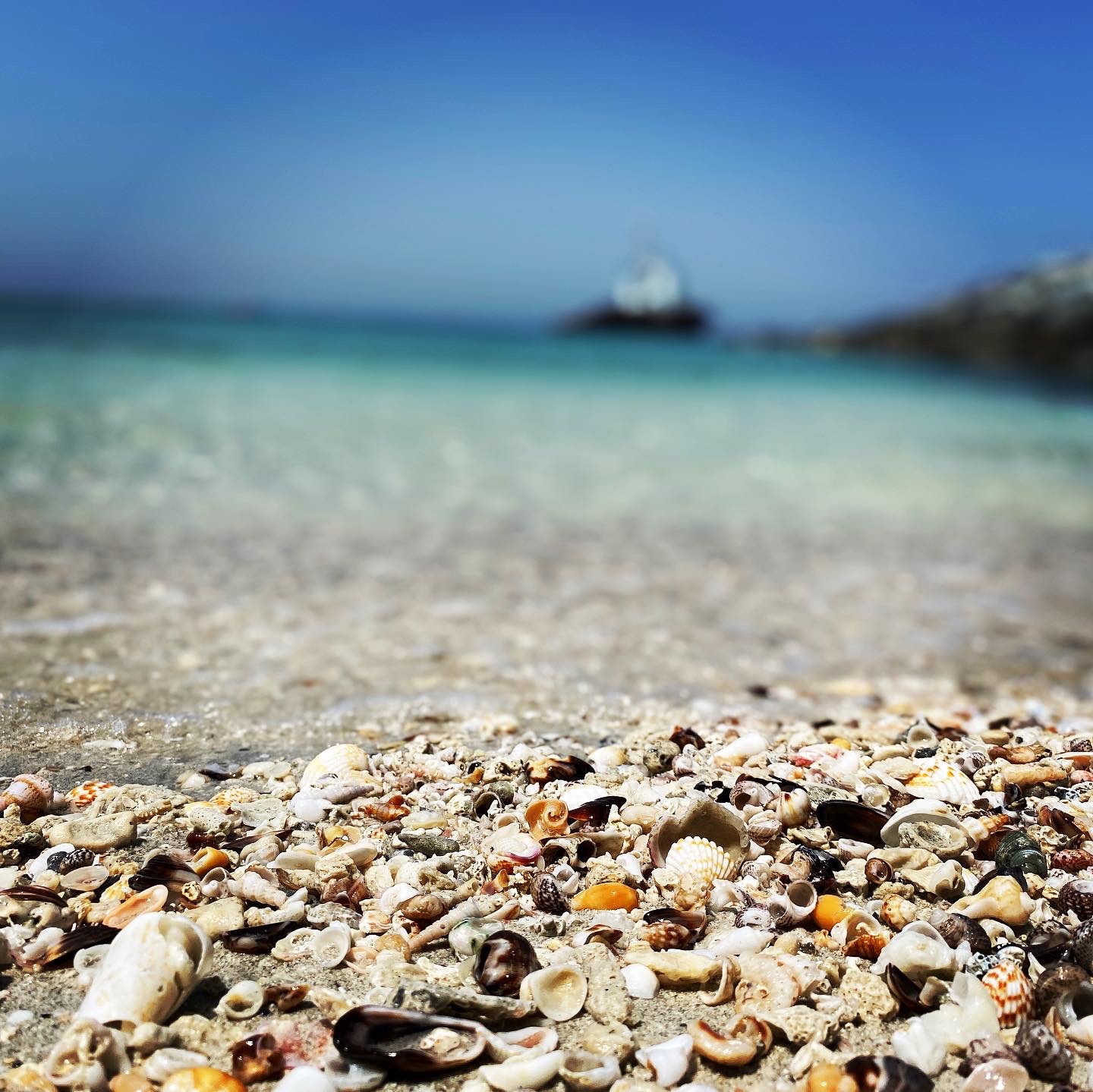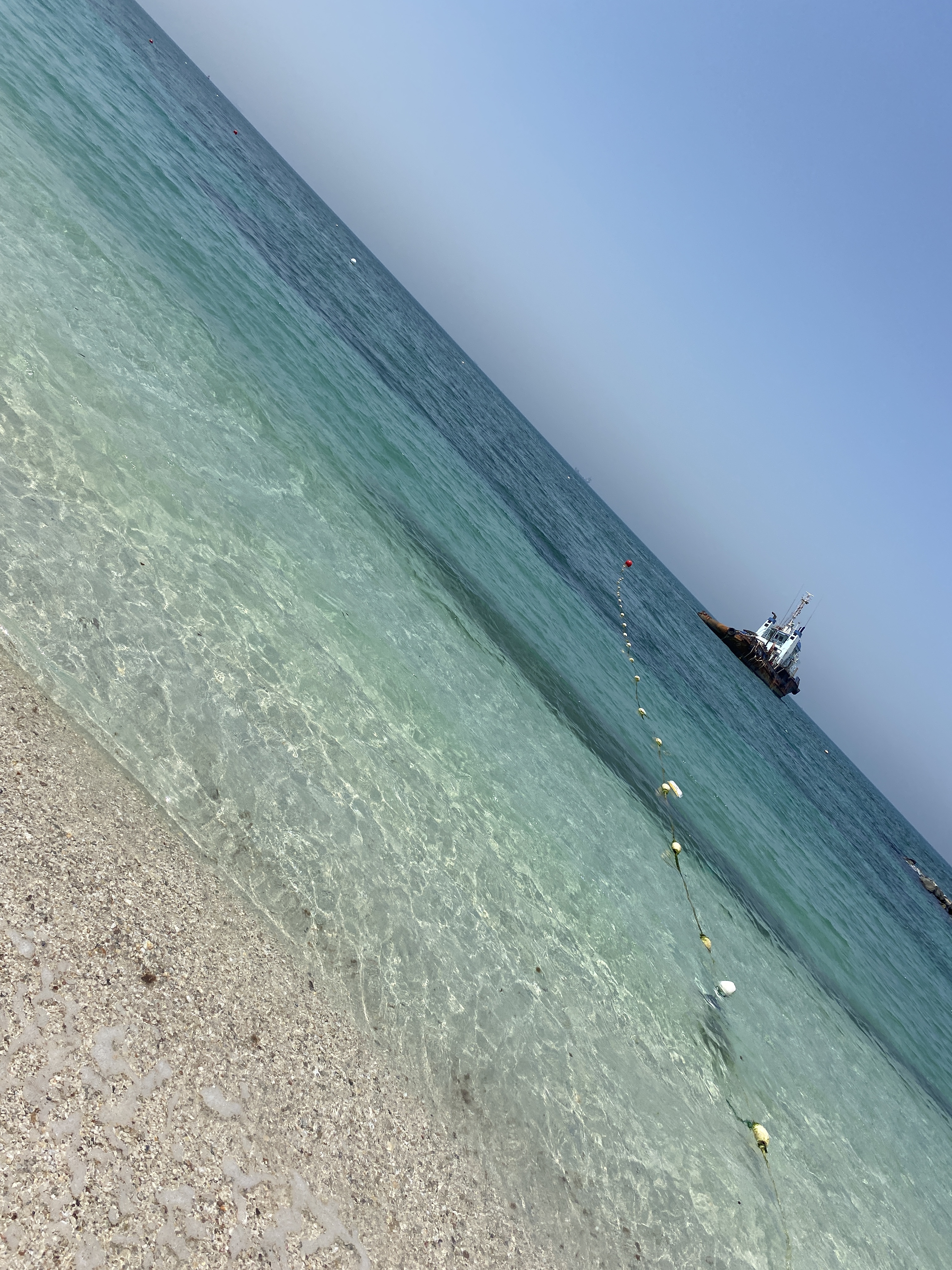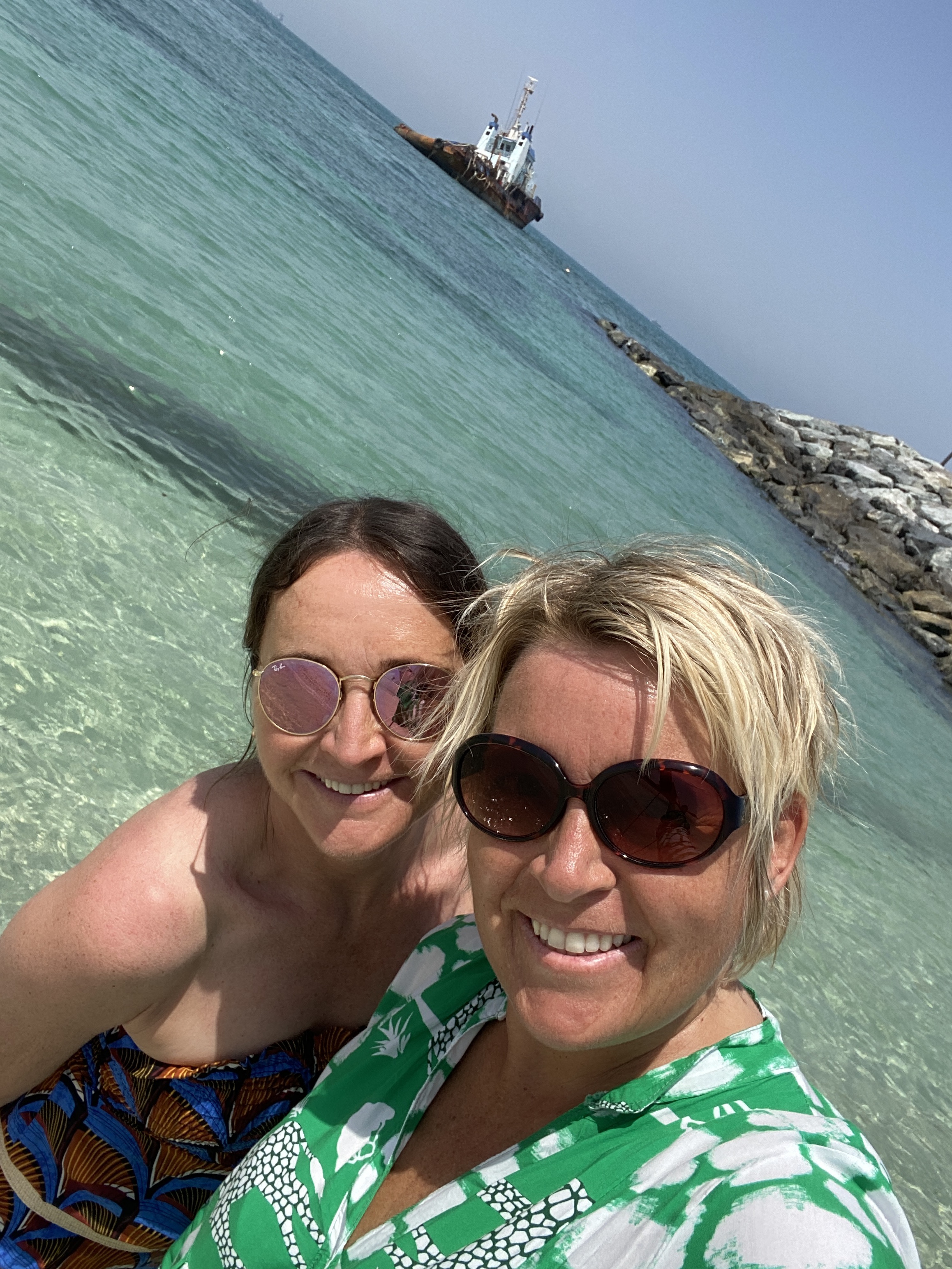 Da wir keine Badesachen eingepackt hatten, war ja nur Wüste und Regen geplant, können wir nur die Füße ins Wasser stecken. Bei den Kindern dauert es nicht lange und natürlich sind sie, mit Klamotten, sehr schnell am Plantschen und Toben. Genießen. Ein Schiffswrack liegt direkt vor uns im Wasser. Die Kinder kraxeln auf den Steinen, wir sammeln wunderschöne Muscheln. Nur ganz weit in der Ferne können wir noch ein paar wenige weitere Strandbesucher sehen.