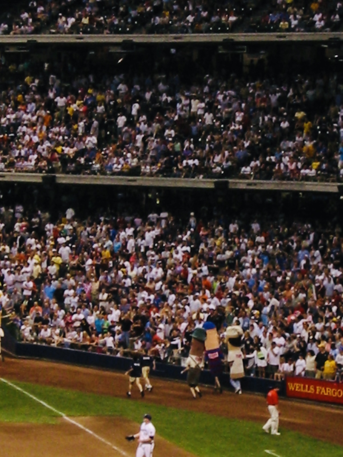 Bei einem Home Run der Brewers rutscht das Maskottchen der Mannschaft, ein Männchen mit großem gelben Schnurbart, Bernie Brewer, auf einer großen gelben Rutsche von einer Etage des Stadions zur darunter liegenden, begleitet von großem Jubel. Außer uns, wir verpassen es erstmal und müssen die Besucher neben uns fragen, was nun los ist, was wir verpasst haben. Beim nächsten Mal wissen wir Bescheid.
