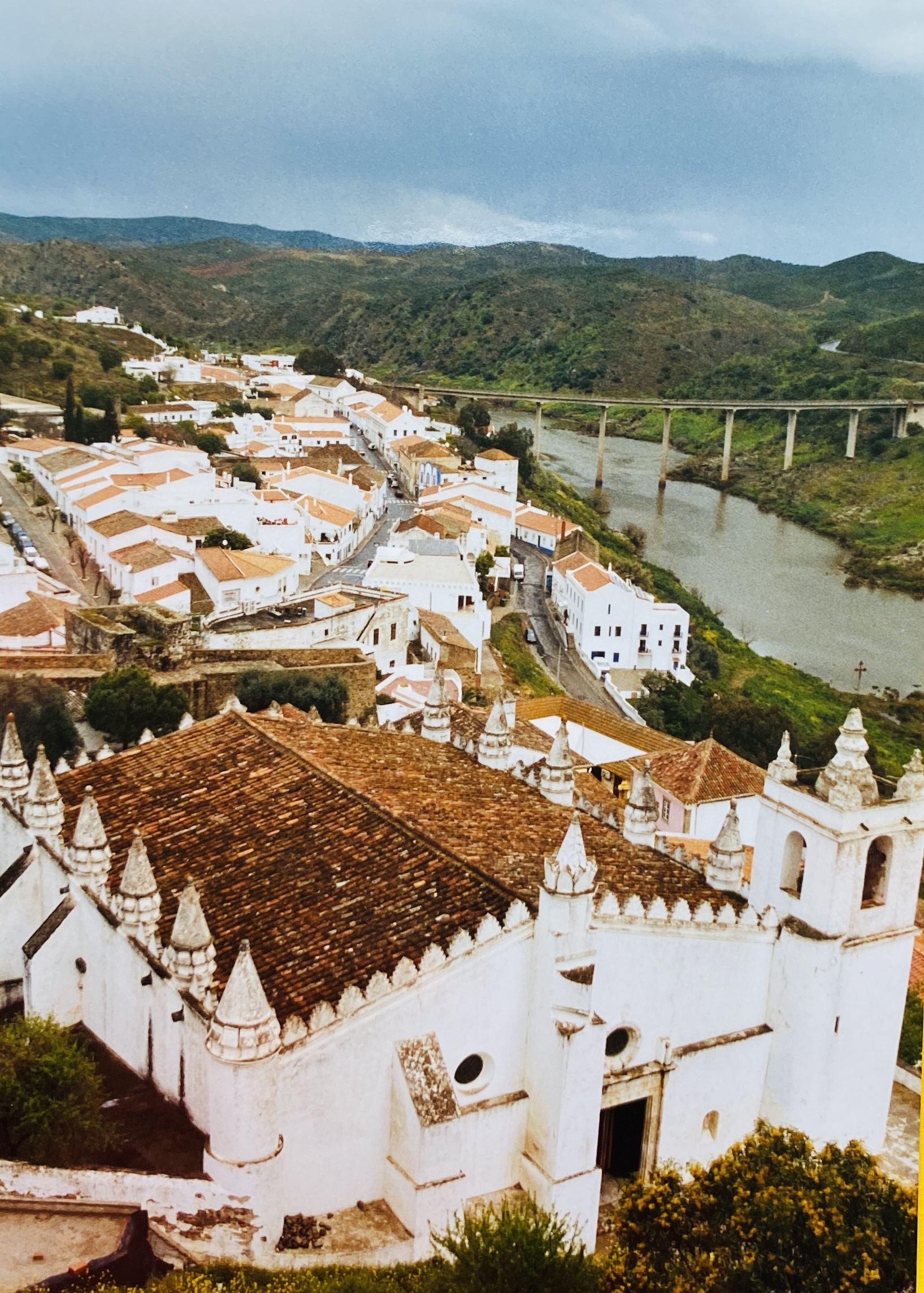 Über einen kleinen Abstecher von unserer Route gelangen wir nach Mértola. Nächster Ort, nächste Burg. Mertóla liegt zwischen zwei Flüssen, was natürlich wieder von oben einen schönen Ausblick bietet. Auch hier ist wieder kaum jemand außer uns und dem Kassierer. Bei ihm zahlen wir unseren Eintritt, damit wir noch den Aussichtsturm besteigen dürfen. Er versucht uns noch zu erklären, was wir mit unserem gezahlten Eintritt zusätzlich im Ort besuchen können. Nett von ihm, aber leider können wir kein Wort Portugiesisch und er kein Wort in irgendeiner anderen Sprache. Er ist super bemüht und versucht es immer wieder.