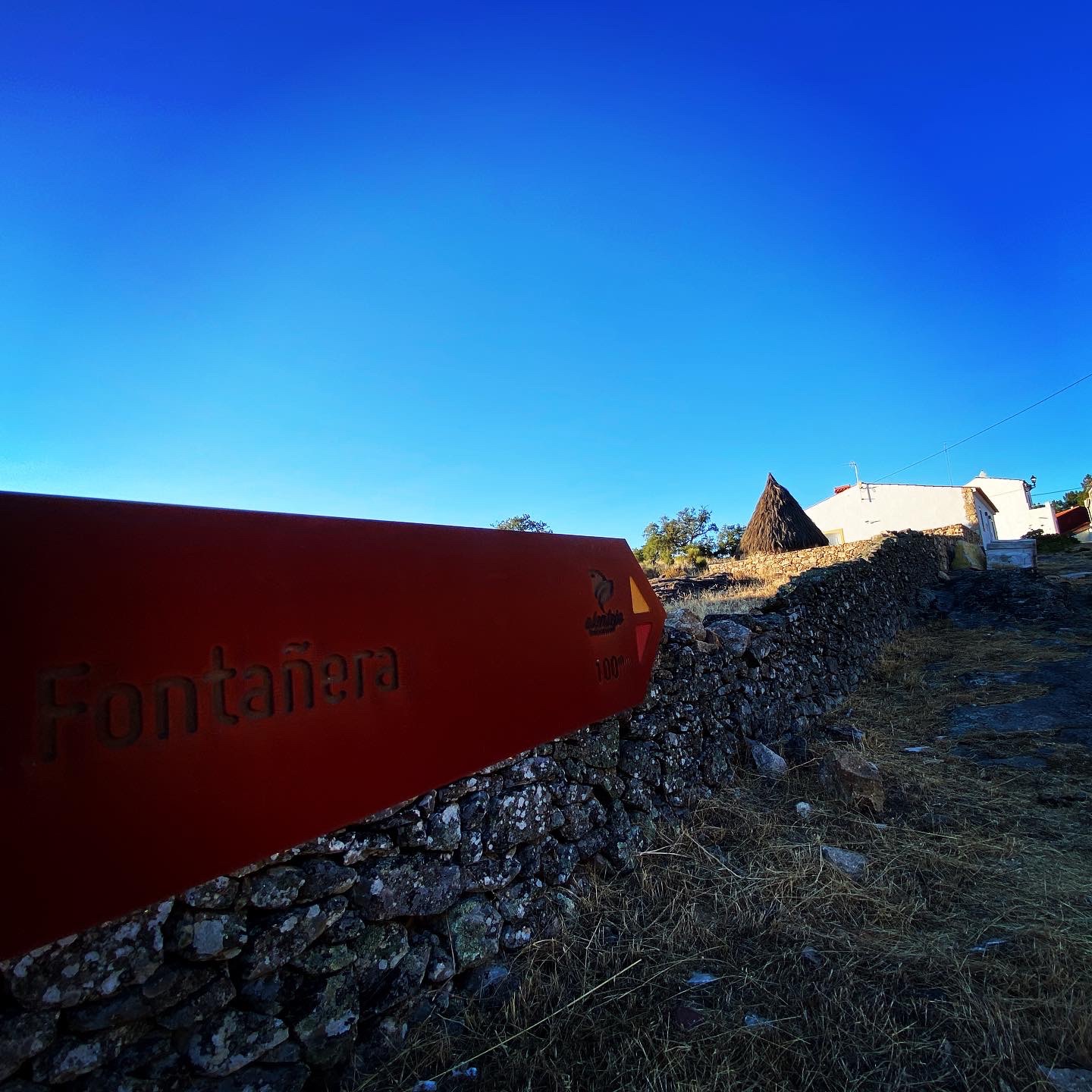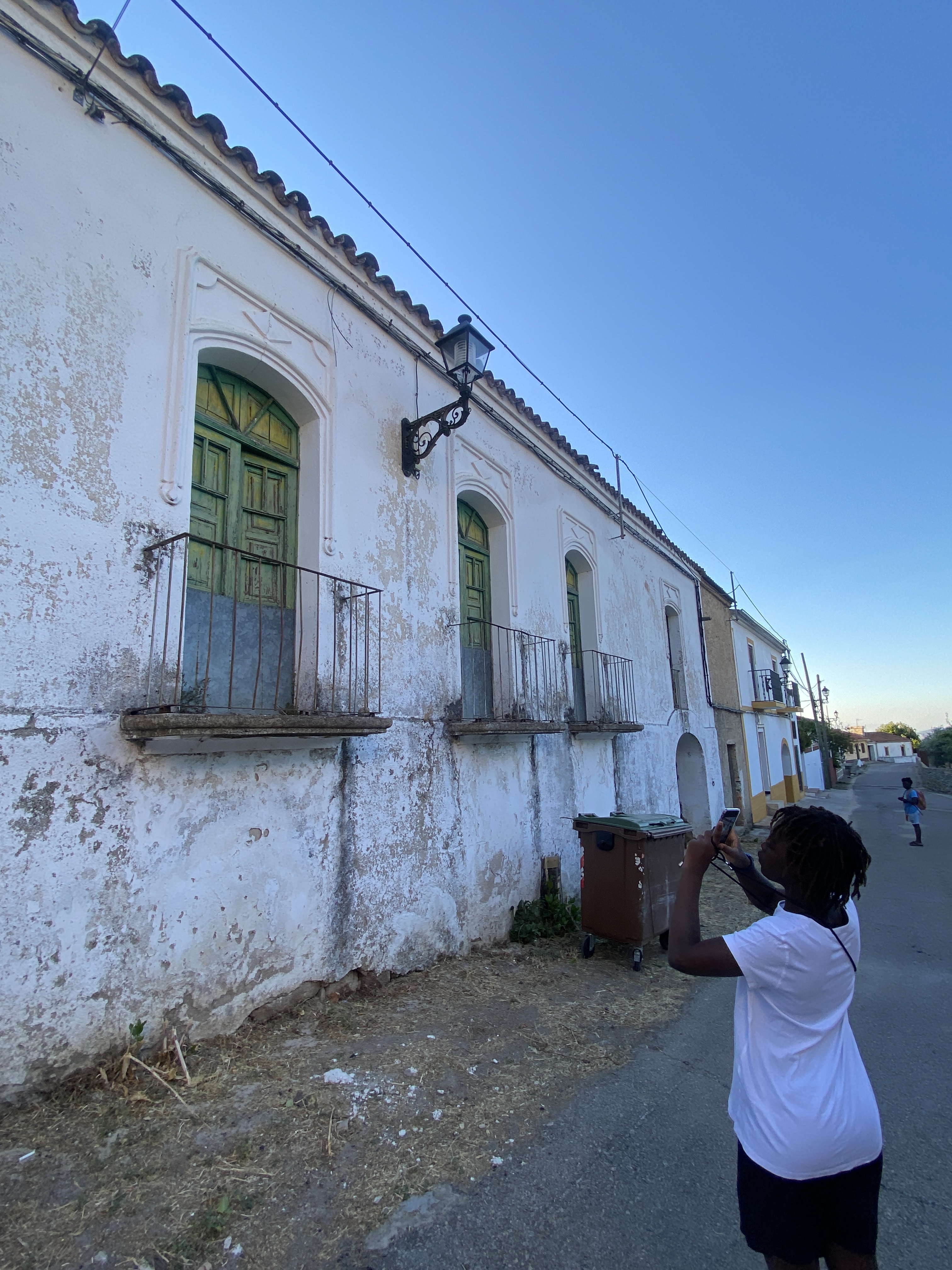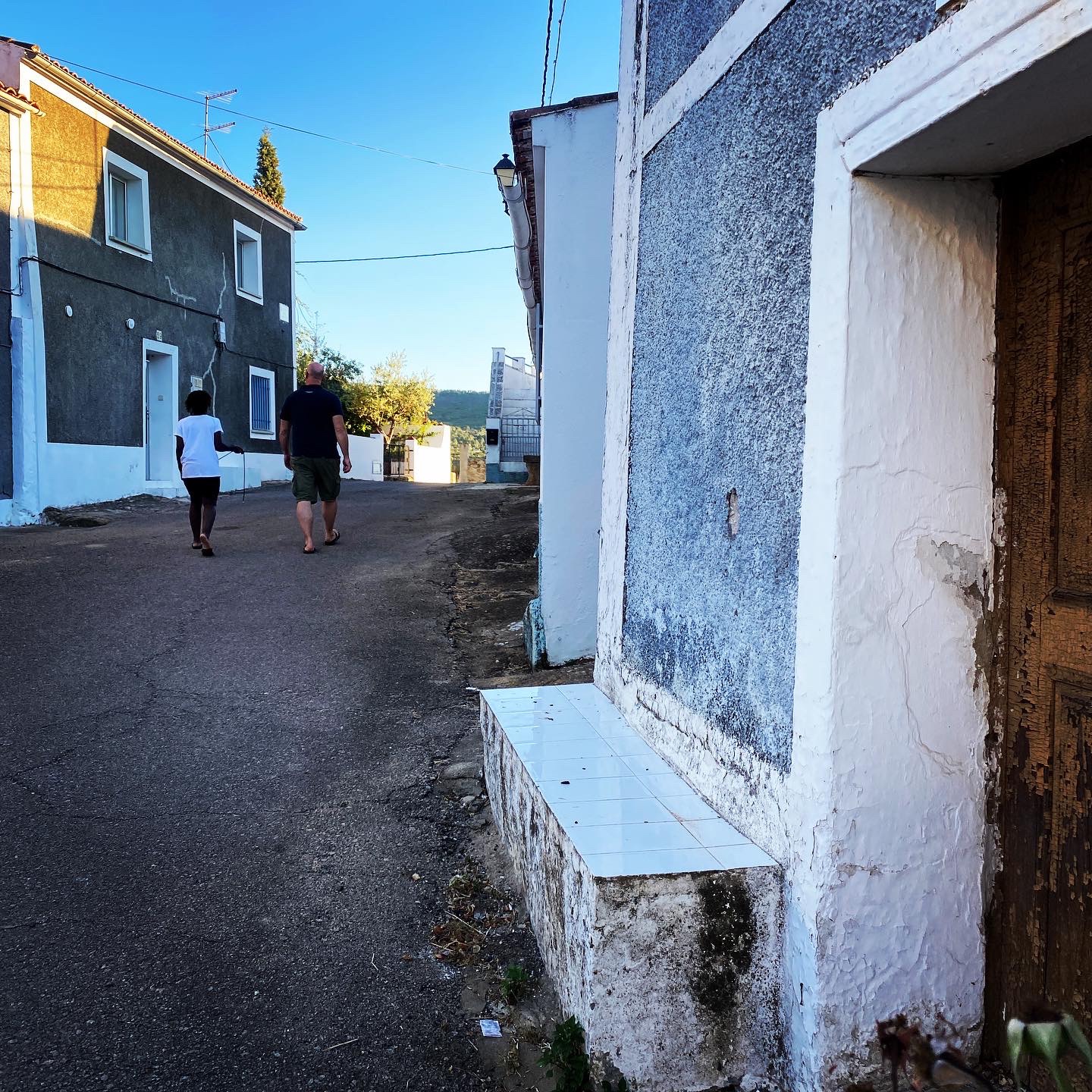 Da werden wir und die Kinder gleich hellhörig. Und somit geht es nach der Poolsession in der Abendsonne los und wir marschieren Richtung grüne Grenze. Wir kommen an einem kleinen Bauernhof vorbei mit einem kläffenden, offensichtlich aber blinden Hund, sonst nur goldenes, langes Gras, das so wunderschön in der Abendsonne leuchtet. Recht schnell sind wir dann an der Grenze. Vollkommen unspektakulär. Zwei Schritte und wir sind in Spanien. Es ist ebenso still und verlassen in dem kleinen Örtchen dort, wie in Galegos auf der portugiesischen Seite. Vor einem Haus sitzt eine Gruppe älterer Menschen auf Plastikhockern oder -stühlen. Über was sie wohl reden? Viel passieren wird hier sicherlich nicht. Wir grüßen freundlich und sorgen ganz sicher dafür, dass sie nun für die nächste halbe Stunde Gesprächsstoff haben. Vielleicht sind wir auch morgen noch Thema… Wir schnappen nur ein paar Wortfetzen auf, aber sie sprechen Spanisch. Ein Auto steht in einer Einfahrt, auch hier das E auf blauem Hintergrund mit Europasternen darüber.
