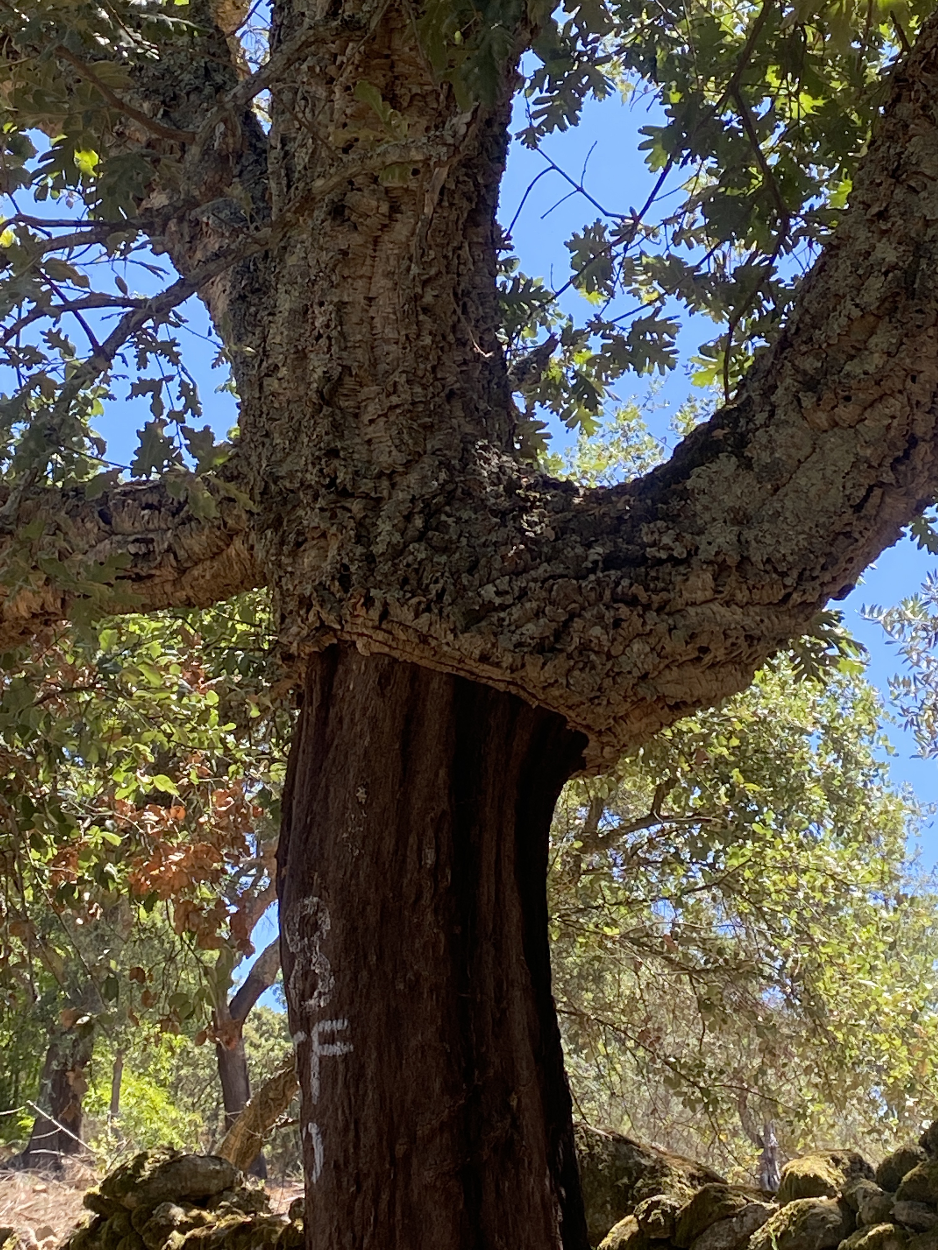 Wir genießen die Leckereien aus dem Farmshop und später gesellt sich Eduardo noch für einen Plausch zu uns. Wir erfahren auch endlich ein bisschen mehr über die Korkeichen. Was mich am meisten fasziniert: Den Kork der Korkeichen kann und darf man alle neun Jahre ernten. Auf den Rinden findet man nämlich immer wieder Zahlen. Mal ausgeschriebene Jahreszahlen, mal aber auch nur eine einzige Zahl. Wir sehen danach alle Korkeichen mit ganz anderen Augen.