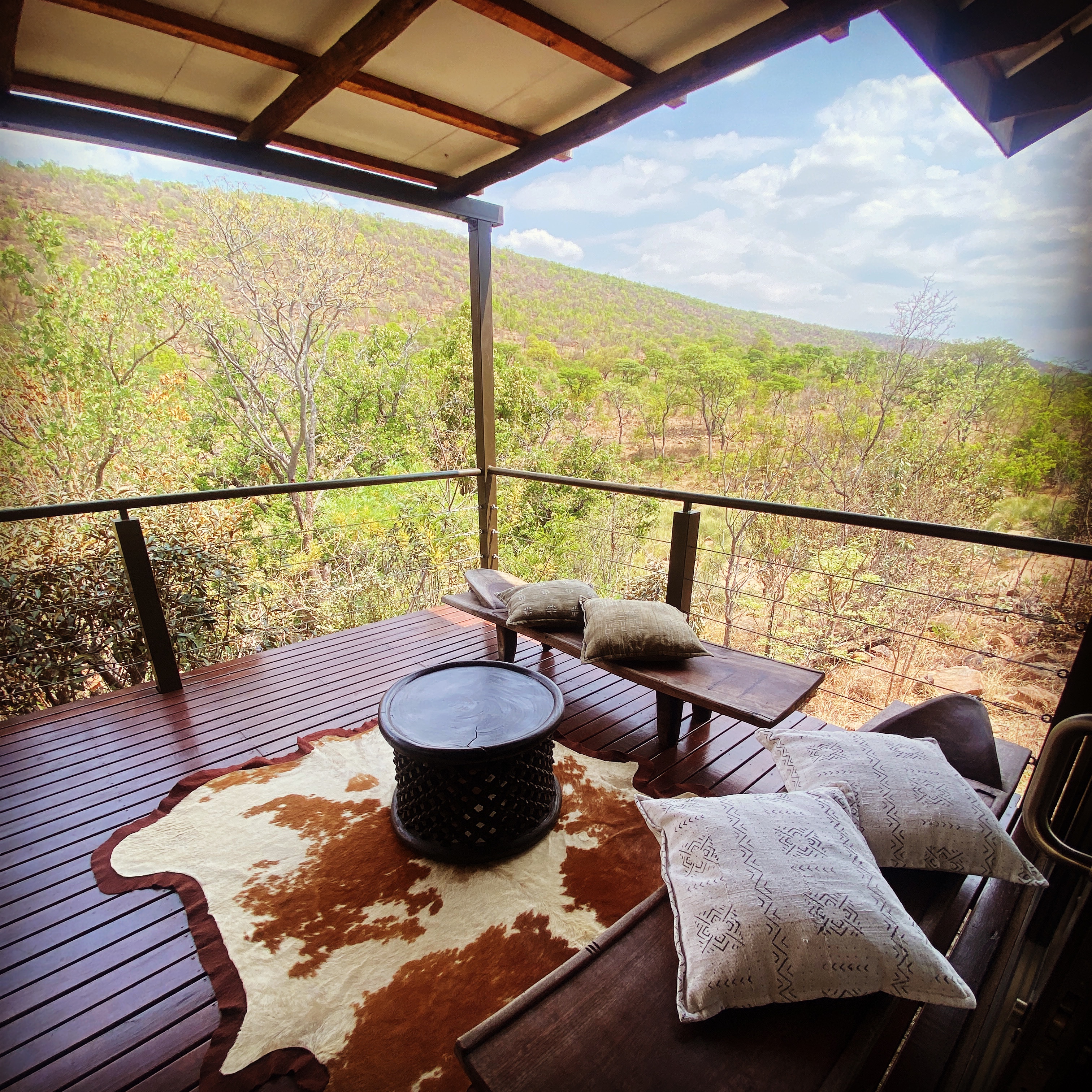 In der Lodge wartet ein weiterer herzlicher, persönlicher Empfang auf uns. Das Besitzer-Ehepaar hat zufällig für ein paar Tage Dienst und empfängt uns mit feuchten Handtüchern, einem glücklichen Lächeln und einem Erfrischungsgetränk. Wir betreten über Holzstege ein Gebäude in Oliv-Grün mit unzähligen afrikanischen Dekoelementen. Wunderschön geschmackvoll und gleichzeitig wundervoll wohnlich und gemütlich. Auf der hölzernen Terrasse mit freiem Blick in den Busch wartet ein gedeckter Tisch auf uns mit einem Mittagssnack. Eigentlich können wir es kaum abwarten, unsere Zimmer zu sehen. Und schon jetzt haben wir das Gefühl, die Entscheidung war die richtige Entscheidung. Denn diese Lodge hat diesen ganz besonderen Afrika Touch zum Wohlfühlen…