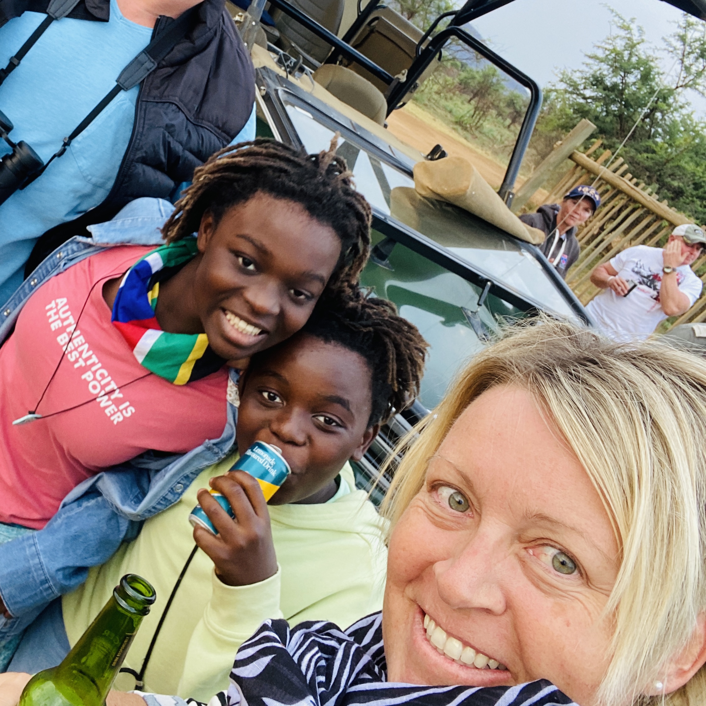Aber der Empfang von unserer extrem motivierten, super netten Safari-Fahrerin, Zaan, für die nächsten Tage ist wunderbar. Freundlich quatscht sie sofort mit den Kindern. Wir werden direkt gefragt, ob wir ein Getränk möchten. Als wir vier Mal Wasser bestellen, hat sie gleich bessere Vorschläge. Zuckerhaltige Softdrinks für die Kinder und alkoholhaltige Erfrischungen für uns. Wir müssen lachen und sind begeistert. Ich nehme ein Savanna Dry, einen südafrikanischen Apfelcider, mein Mann ein Windhoek, ein namibianisches Bier. Was für ein herzlicher, willkommener Empfang.