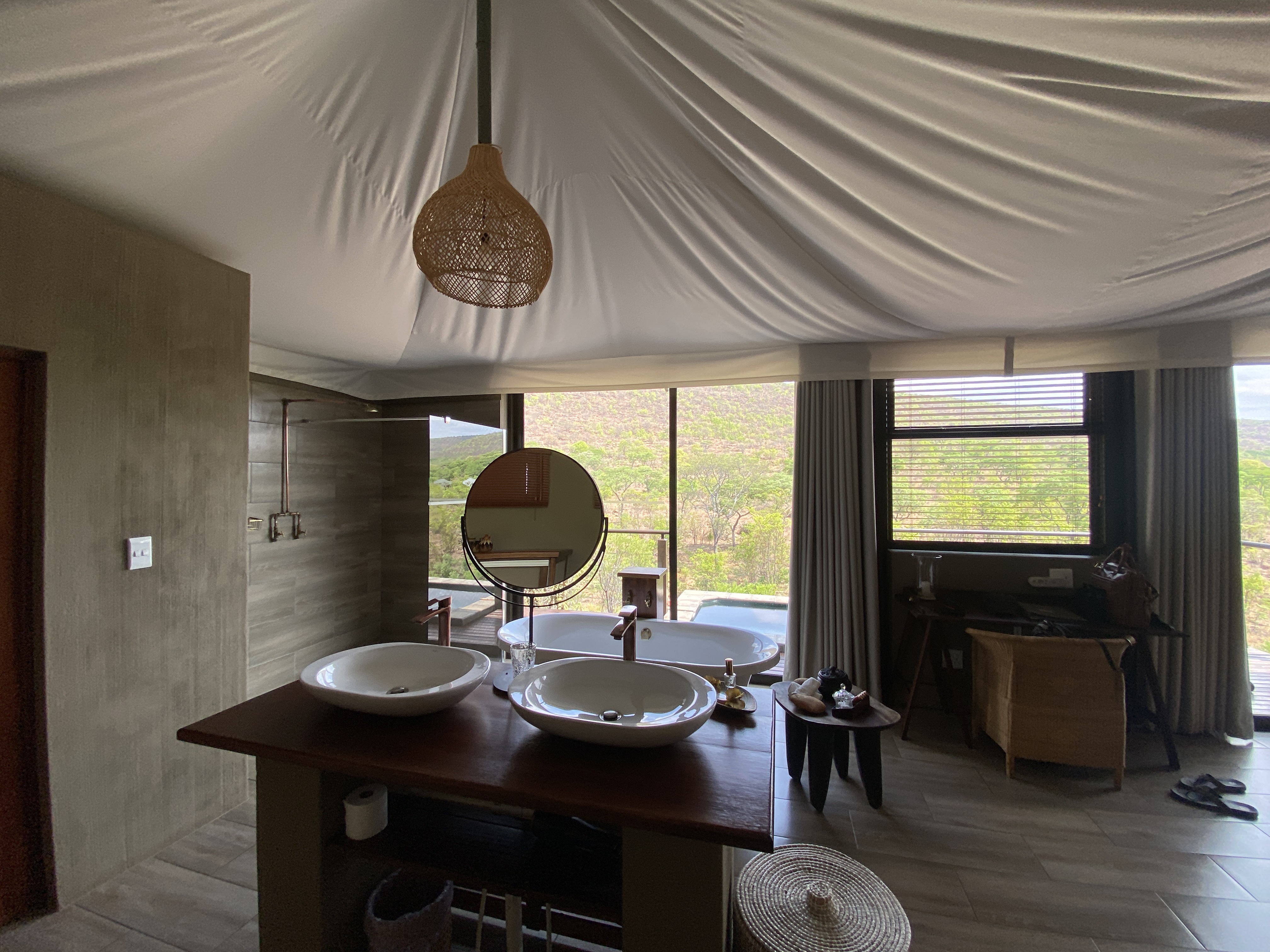 Durch eine Holztür betreten wir unseren kleinen persönlichen „Palast“, ohne Kronleuchter und Gold, dafür mit einem Zeltdach und einer Leinwand der ganz großen Extraklasse. Auch in diesem Bungalow ist die eine Seite komplett aus Glas und gibt den Blick frei auf den gegenüberliegenden Hang – frei Wildbahn.