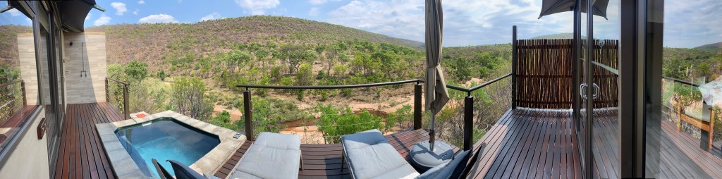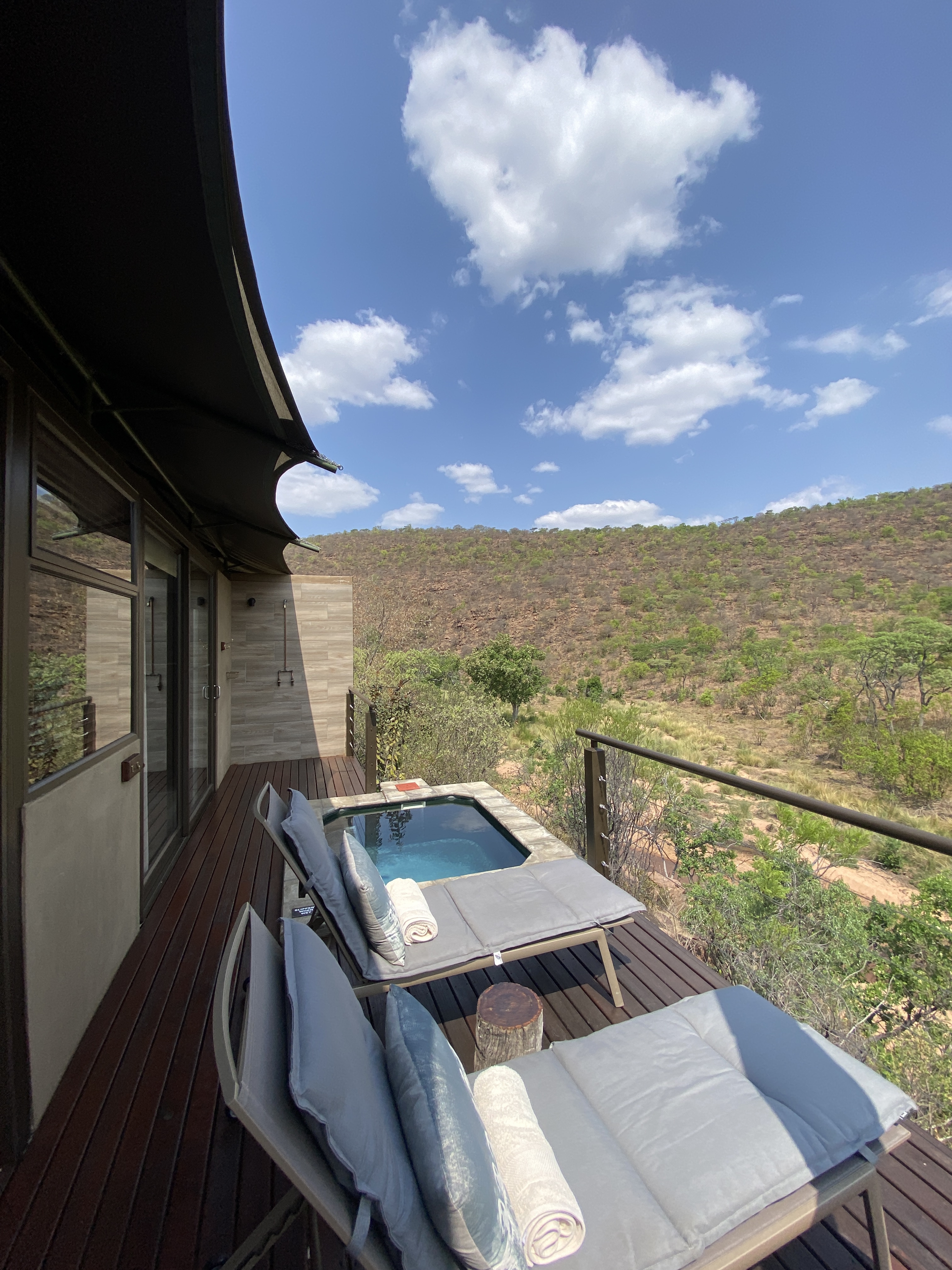Die große Holzterrasse scheint fast über dem Abhang zu schweben. Darunter ein Fluss mit stellenweise weiten Sandbänken. Der schützende Wildzaun liegt unter unserer Terrasse, auf unserer Flussseite, was bedeutet, dass wir freien Blick auf die NaturLeinwand haben, auf der eventuell der Film „Tiere in der Wildnis“ laufen könnte. Zwei Sonnenliegen sind die einladenden Kinosessel, daneben noch ein Splashpool, der auch einen guten Platz zur Wildbeobachtung an heißen Tagen bietet. Am linken Ende der Terrasse eine Außendusche, geschützt vor den Blicken der Nachbarn, aber ebenfalls mit freiem Blick auf die Live Szenen. Einfach nur gigantisch schön.