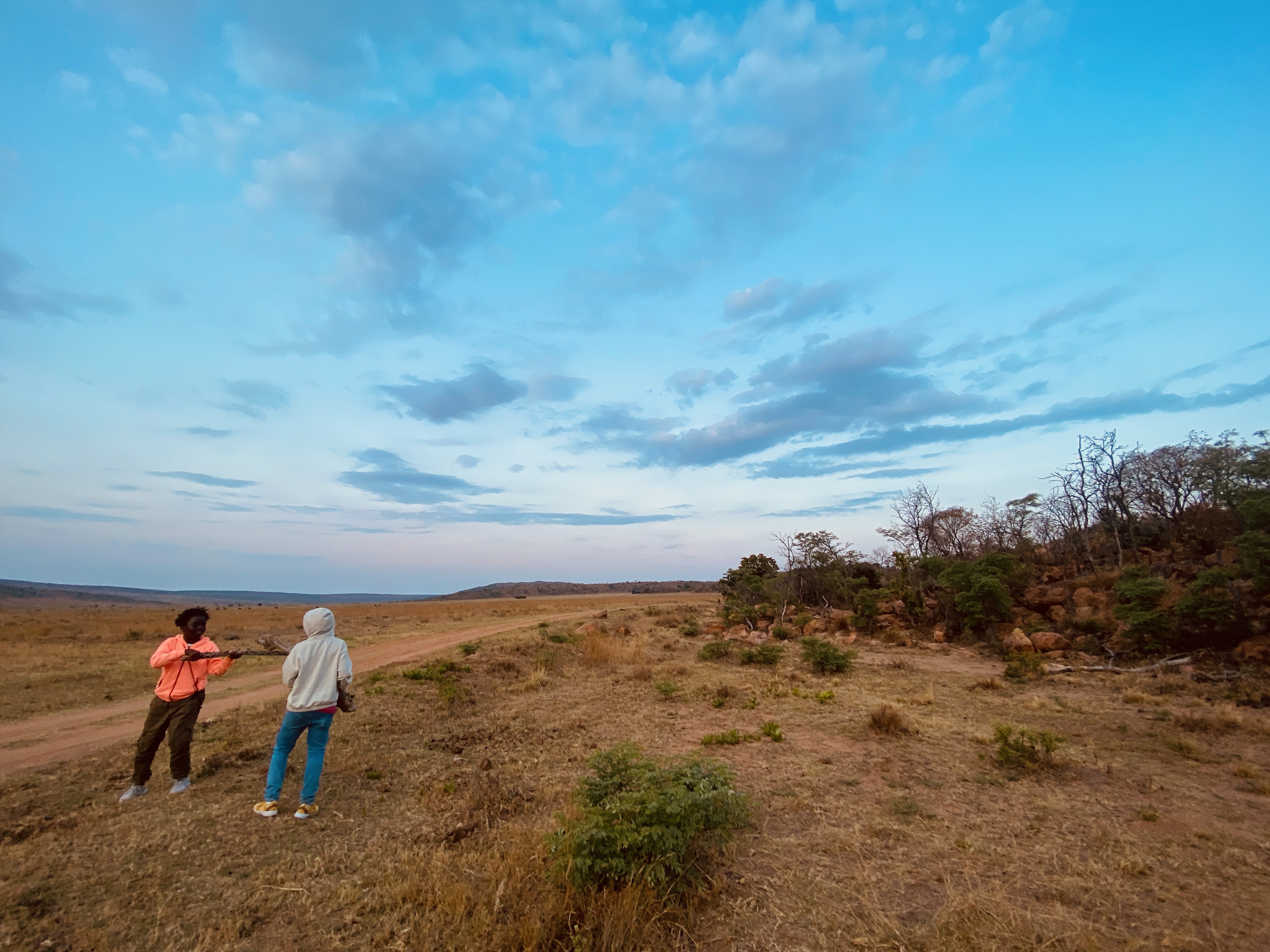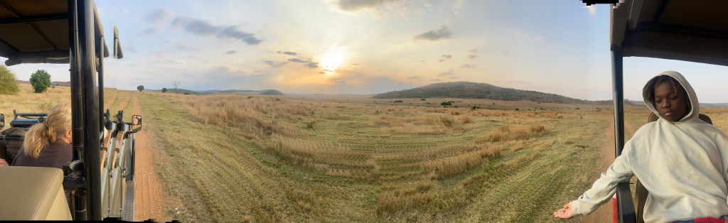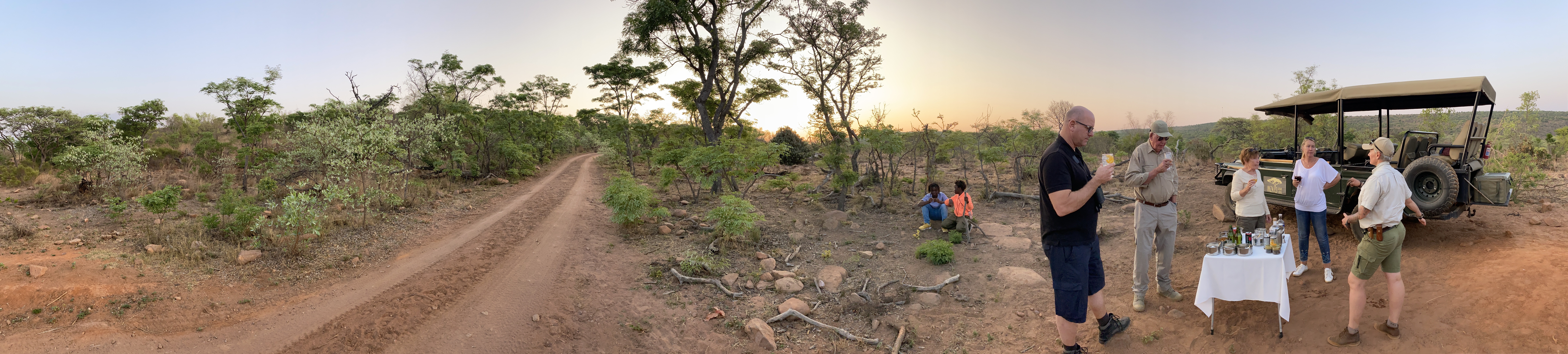 Er steht wieder auf, läuft ein paar Meter. Sitzt in der Sonne und starrt in den Busch. Wir starren gleich hinterher. Aber wir sehen nichts. Hat er was entdeckt? Wird er gleich jagen? Dann liegt er wieder. Also keine Jagd. Über eine halbe Stunde verweilen wir einfach nur und beobachten. Motor aus. Ruhe. Das ist Erholung pur. Dann beschließen wir, weiter zu fahren. Kurze Zeit später queren wir eine schmale, kurze Betonbrücke, d.h. wollen wir queren. Auf der anderen Seite, direkt neben der Brücke stehen allerdings zwei Nashörner und trinken. Also warten wir und beobachten wieder. So geht die Zeit dahin. Wir überlegen noch, ob wir umdrehen sollen und einen anderen Weg nehmen sollen, aber dann ist doch der Durst gestillt und die beiden ziehen weiter in den Busch hinein, weg vom Weg. Wir können weiterfahren. Fast schon wieder Zeit für unseren Sundowner. Zaan kennt wieder den perfekten Spot und natürlich hat sie das perfekte Getränk, mein Savanna, in der Kühlbox. Der letzte Abend. Die Mitreisenden sind super nett, wir machen noch viele gemeinsame Fotos bei dem Stopp. Die Kinder sitzen gechillt auf einem Stein und quatschen. Ich bin ja immer ein bisschen nervös, es könnte ja doch etwas Tierisches aus dem Busch auftauchen… Aber alles gut, wir kommen überglücklich auch an diesem letzten Abend im Busch wieder in der Lodge an, wo erneut feuchte Tücher auf uns warten und ein herzlicher Empfang. Der Eingang ist extra mit KerzenLampen geziert, die gelöscht werden, so bald wir das Haus betreten haben. Die Liebe steckt im Detail. Wir genießen heute erneut ein köstliches Abendessen. Die Kinder wieder ihre Käse-Sandwiches, wir ein sehr gutes Steak. Heute sitzen wir auf der Holzterrasse. In dieser wunderschönen Lodge heute nur wir vier und die drei netten Safaribegleiter des heutigen Tages.