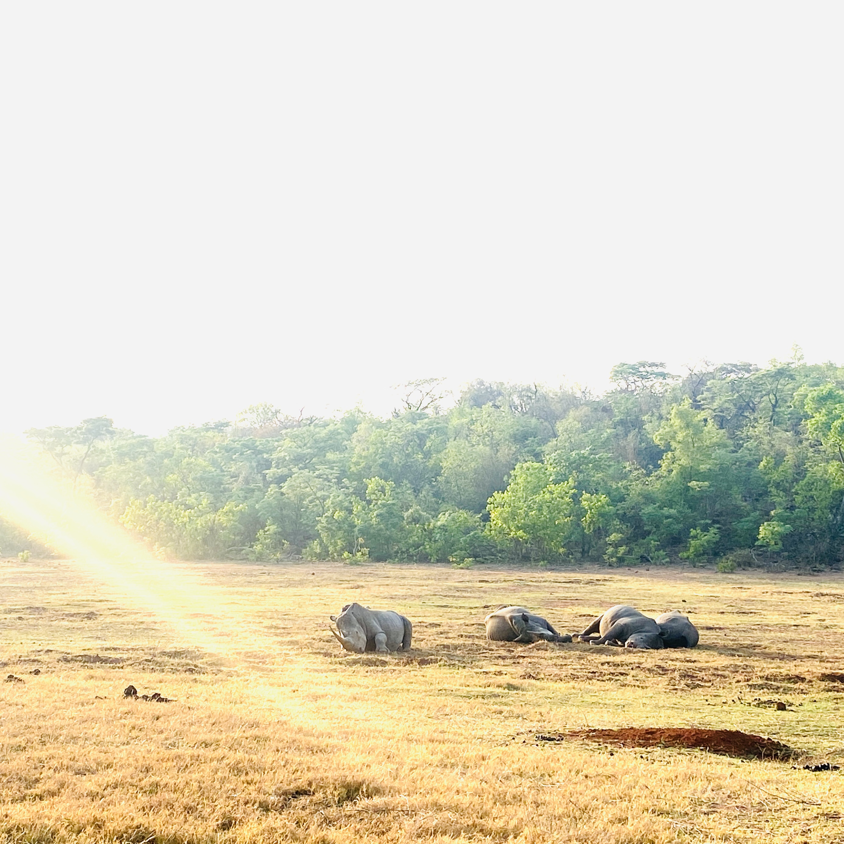 Im Hauptgebäude wartet wieder frischer Kaffee auf die Eltern und heiße Schokolade auf die Kinder. Natürlich starten hier sofort die Gespräche über das nächtliche Löwenerlebnis. Der Hausherr versichert, dass der Löwe natürlich nicht im Camp, sondern doch einige sichere Meter davon entfernt sein Brüllkonzert abgehalten hat. Beruhigend. Heute sitzen wir mit einer neuen Familie im Fahrzeug. Die Tochter, Lehrerin an einer internationalen Schule in Pretoria, und ihre Eltern, zu Besuch aus Holland. Sehr tolle Gespräche entstehen, die Stimmung ist super harmonisch. Kurz nach Abfahrt spiegelt sich im kleinen Flüsschen wunderschön in der Morgendämmerung der Himmel. Wir treffen auf eine Ansammlung Nashörner, die noch alle am Boden liegen und schlafen. Wahrscheinlich hat auch die nachts der Löwe wachgehalten. Da wir fast 10 Jahre in Johannesburg gelebt haben, war ich schon auf sehr vielen Game-Drives, aber schlafende Nashörner habe ich noch nie gesehen. Die Natur hat wirklich immer wieder neue Eindrücke für einen bereit. Hinter dem Nachtlager geht die Sonner auf. Eine Familie Warzenschweine läuft mit erhobenen Schwänzchen an den Schlafenden vorbei, ab in den Busch – weg sind sie. Eine Ruhe, wunderschön. Ein Gnu steht am Wegrand und frühstückt. Vor uns die lange, rote Sandpiste durch den Busch, mehr Warzenschweine, ein Kudu und ein Klipspringer. Es ist friedlich und ruhig und die Tiere scheinen heute länger zu schlafen, als ich. Bei unserem morgendlichen Kaffeestopp im Busch verteilt Zaan silberne, runde Blechdosen für jeden. Darin jeweils ein Keks mit Zitronencreme Dip, zwei Orangenstücke, hausgemachte kleine Müsliriegel und ein Miniscone. Eine rote Masai Decke ziert den Campingtisch. Stopp mit Stil im Busch. Ich liebe es. Dazu ein heißer Kaffee mit einem klitzekleinen Schuss Amarula. Die nette Gesellschaft passt auch perfekt. Harmonie.