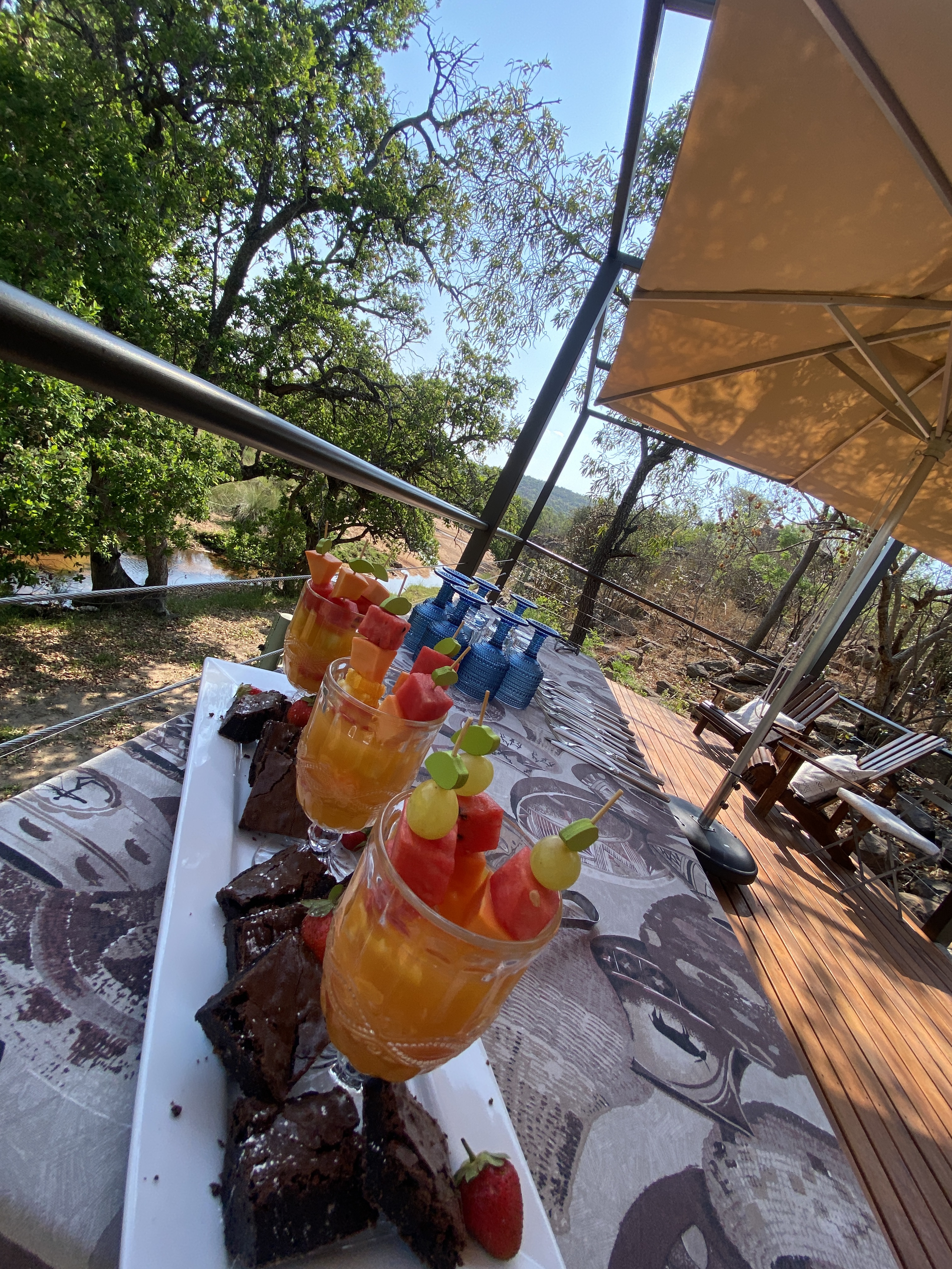 Am frühen Nachmittag begeben wir uns wieder auf die mittlere Flussterrasse. Hier soll heute der kleine Snack, vor dem Game-Drive serviert werden. Heute Morgen war hier noch der Elefant, mein Sohn und ich. Jetzt warten frische Obstspieße und Brownies, Nüsse und Kekse auf uns. Begleitet von einem Glas Weiswein mit Eiswürfeln und einer Affenbande auf der gegenüberliegenden Flussseite. Es ist nie wirklich nie langweilig im Busch.