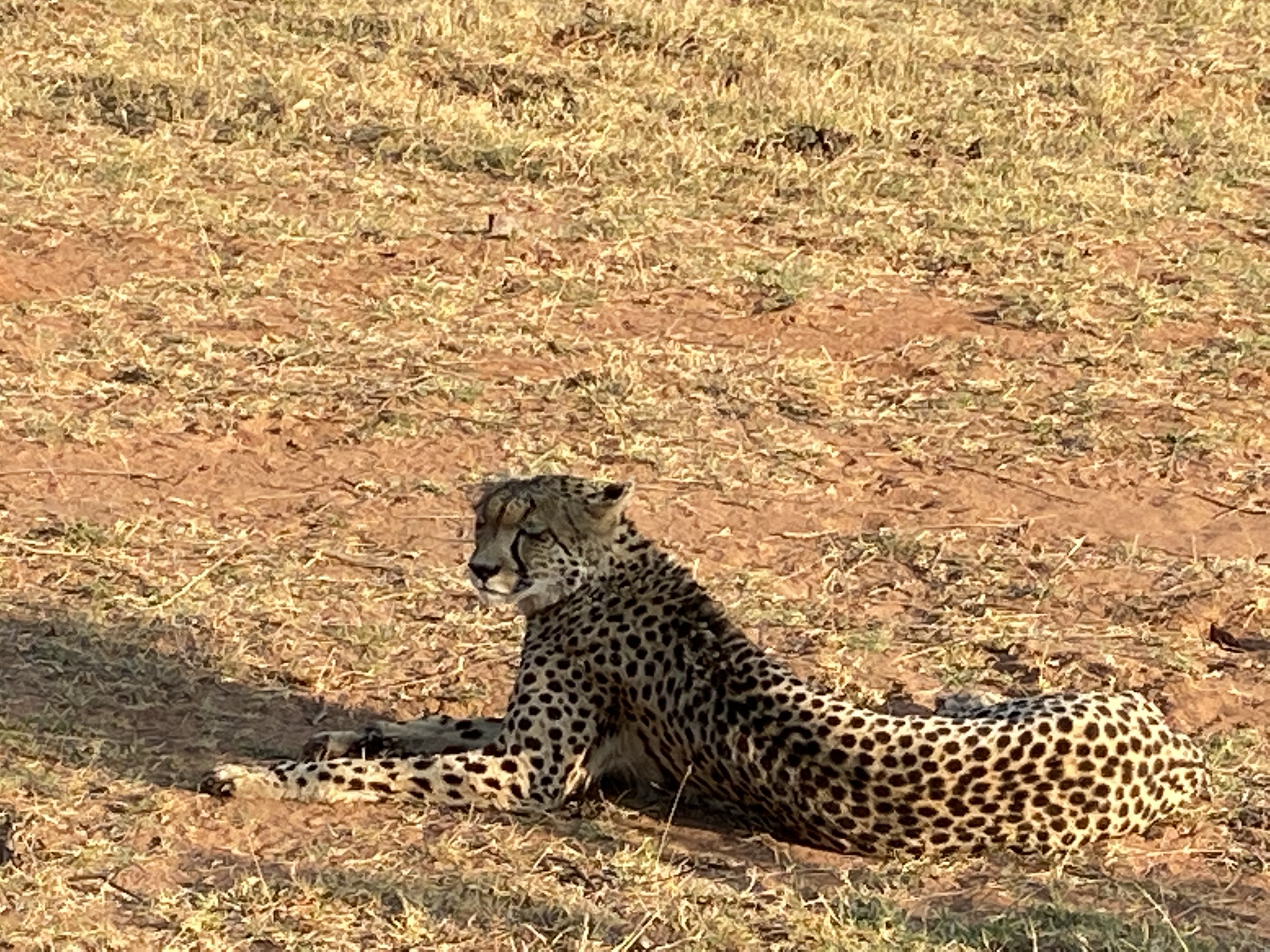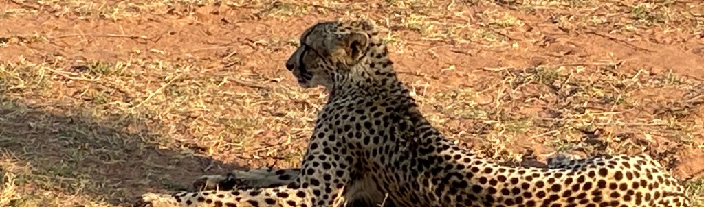 Dieses Gefühl ins Safarifahrzeug zu klettern, irgendwie der Einstieg in Abenteuer. Es fühlt sich einfach frei und ein bisschen wild an. Was erwartet uns heute? Gleich zu Beginn ein imposanter Wasserbock, einfach zu erkennen an der „Klodeckel“-Form, die ihm am Hinterteil „klebt“. Nur wenige Meter später – direkt vor uns auf der Buschpiste ein ausgewachsener, wunderschöner Gepard. Blockbuster-reif. Er quert unseren Weg und lässt sich in einem kleinen Schatten nieder, der glücklicherweise von einem Baum direkt neben uns ins Gras geworfen wird. Und da liegt er. DIREKT neben uns. Sichtlich unbeeindruckt von unserer Gegenwart.