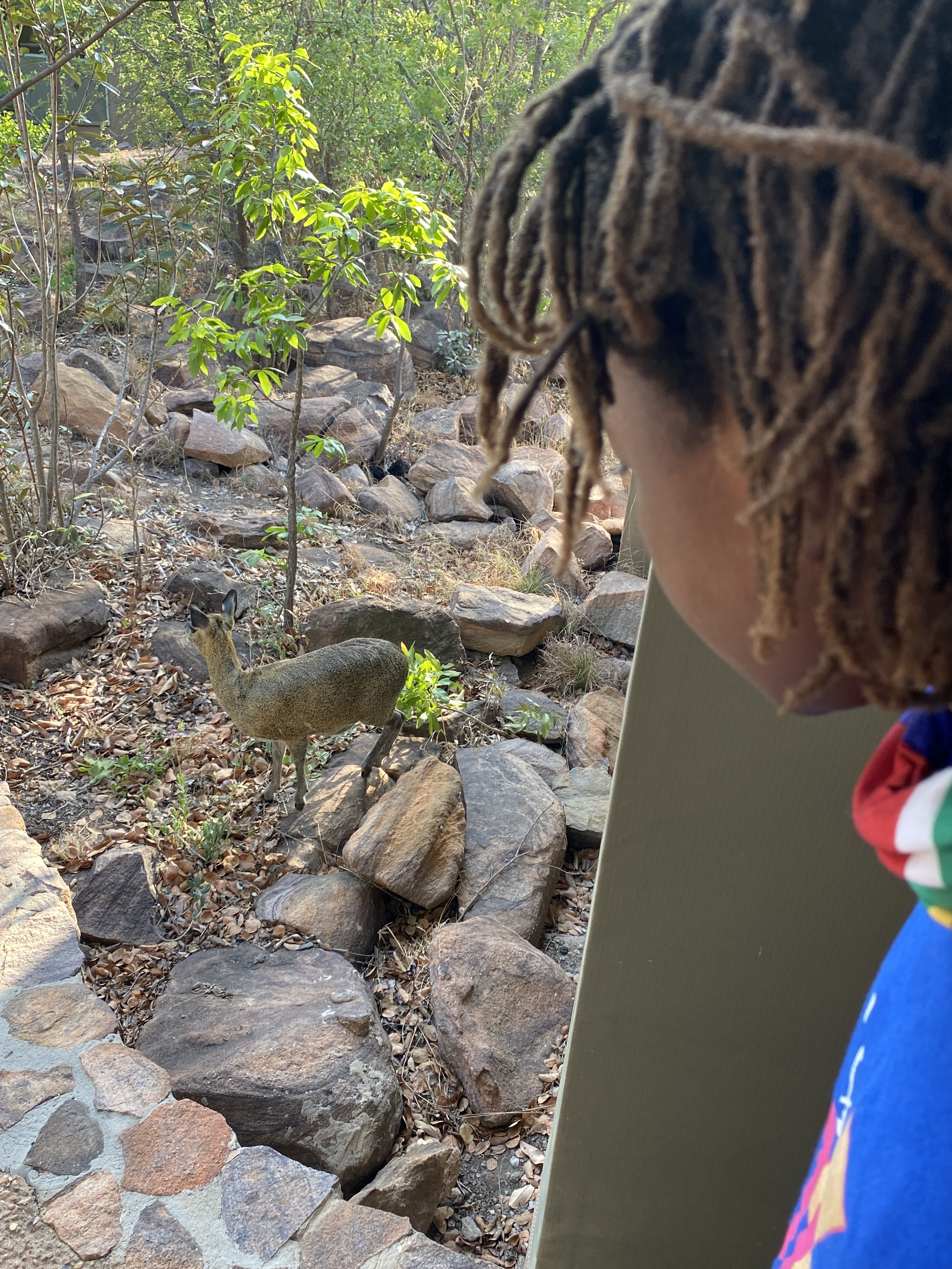 Und weil wir heute nicht in den Busch kommen, kommt der Busch zu uns. Der Löwe schafft es ja angeblich nicht ins Camp, aber heute überrascht uns ein Klipspringer direkt vor der Haustür der Kinder. Was für eine Überraschung. Wie gut, dass die Tür heute mal geschlossen war… In unserem Bad entdecke ich noch eine wunderschöne Spinne.