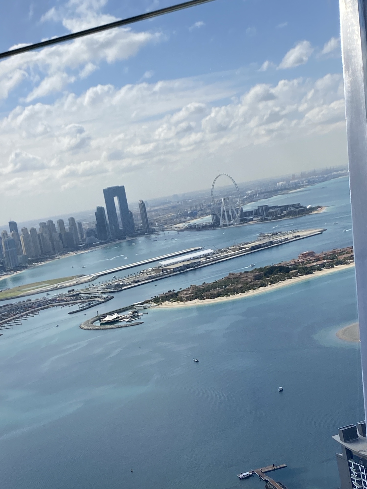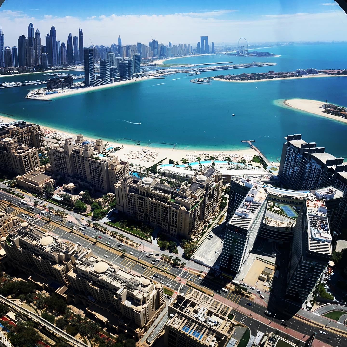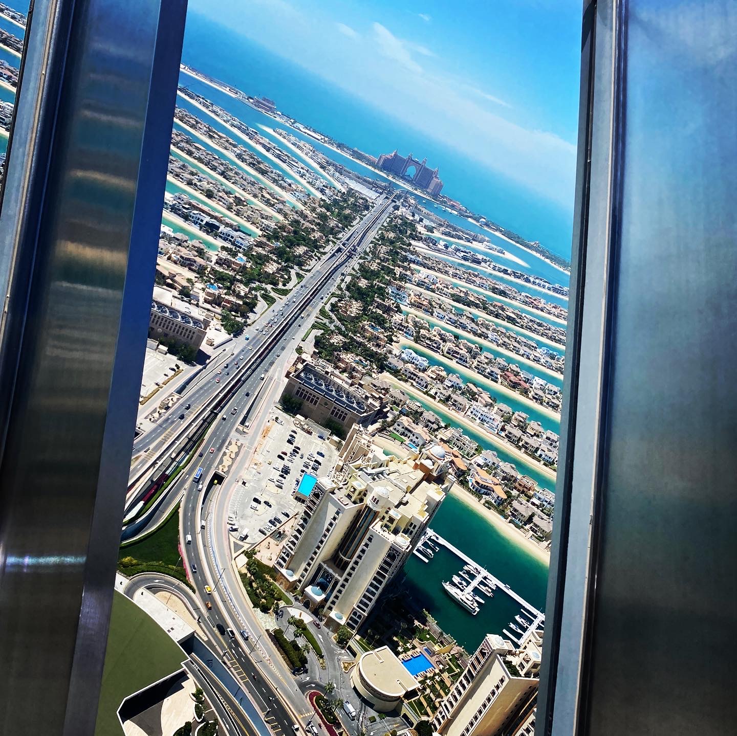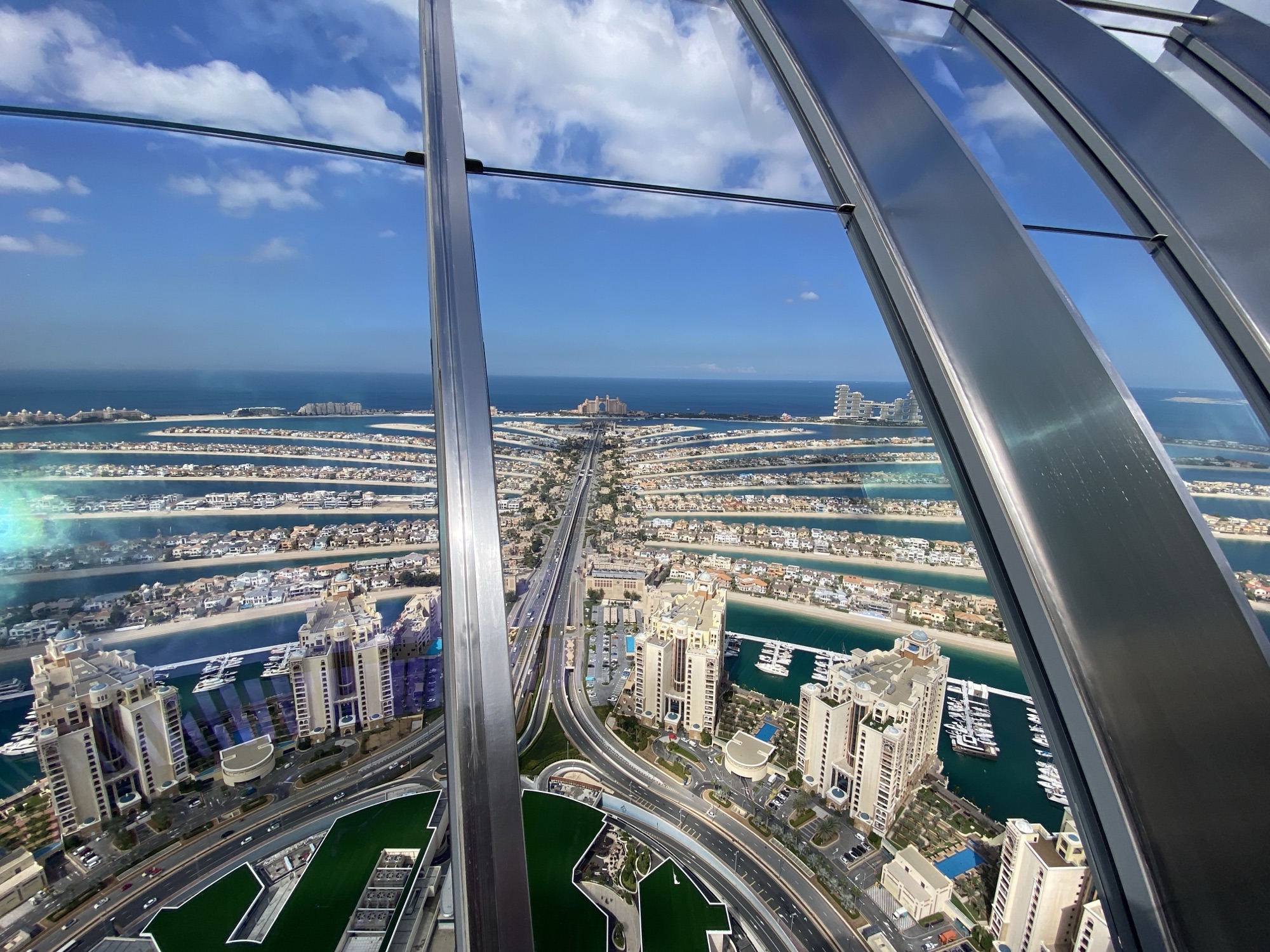 Ich buche für den The View immer den 52. Stock auf 240 m Höhe. Von hier oben hat man bei klarem Wetter einen perfekten Blick über die ganze Palme bis hin zu den Hotels auf dem äußeren Ring; auf der einen Seite schaut man bis hin zu Bluewater Island mit dem Riesenrad Ain Dubai, daneben den JBR Beach mit der Marina im Hintergrund. Auf der anderen Seite sieht man bis hin zum Burj al Arab und meist auch bis zum Burj Khalifa in Downtown Dubai.