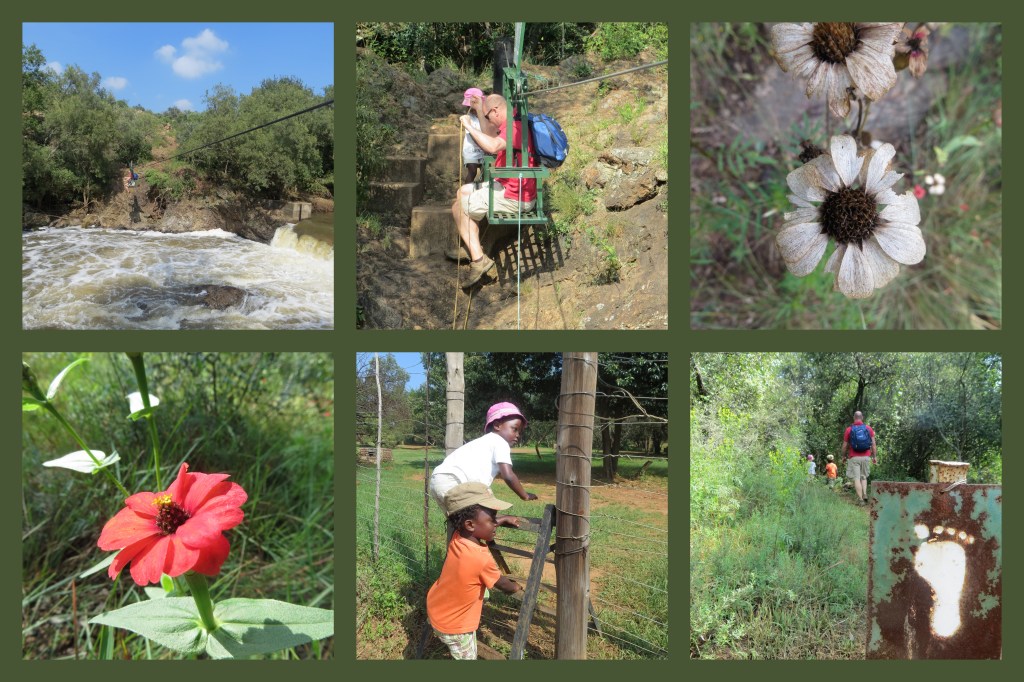 Zurück in der Lodge werden wir mit einem Abendessen am Lagerfeuer überrascht. Tierische Tischdeko: Serviettenschwäne (…oder sind es Servietten-Blue Cranes?) stecken in unseren Gläsern, Falter aller Art tummeln sich um die Kerzen auf unserem Tisch. Unser Sohn ist gar nicht so begeistert… Ihm ist einmal bei einer Safarifahrt am Abend ein Käfer ins Ohr gekommen, er konnte ihn innen laufen hören. Große Aktion bis der wieder draußen war. Somit ist er etwas vorbelastet und zieht jetzt spontan zum Essen die Mütze seines Kapuzenpullis auf. Die Kinder sind wieder so erschöpft vom Tag, dass statt dem bezahlten 3-Gänge-Menü, erneut Käsetoasts bestellt werden und sich die beiden sofort nach Verzehr in ihr Zimmer zurückziehen. Gute Nacht. Wir erklären noch einmal ausführlich, dass sie daran denken sollen, die Türe ordentlich zu verschließen und dass wir sie morgen wieder um 6:30 Uhr wecken werden.