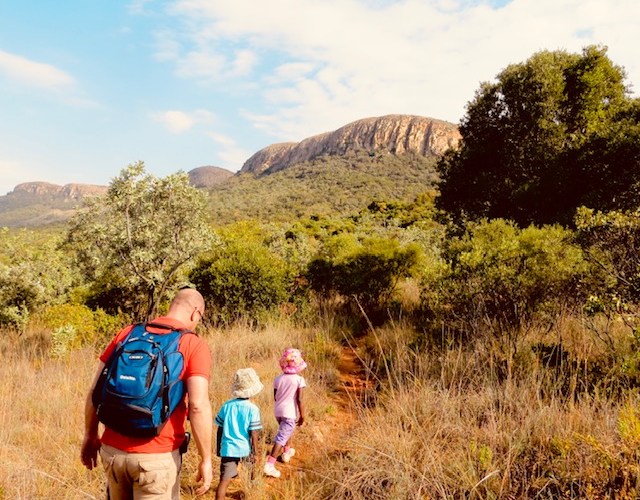 Er steht wieder auf, läuft ein paar Meter. Sitzt in der Sonne und starrt in den Busch. Wir starren gleich hinterher. Aber wir sehen nichts. Hat er was entdeckt? Wird er gleich jagen? Dann liegt er wieder. Also keine Jagd. Über eine halbe Stunde verweilen wir einfach nur und beobachten. Motor aus. Ruhe. Das ist Erholung pur. Dann beschließen wir, weiter zu fahren. Kurze Zeit später queren wir eine schmale, kurze Betonbrücke, d.h. wollen wir queren. Auf der anderen Seite, direkt neben der Brücke stehen allerdings zwei Nashörner und trinken. Also warten wir und beobachten wieder. So geht die Zeit dahin. Wir überlegen noch, ob wir umdrehen sollen und einen anderen Weg nehmen sollen, aber dann ist doch der Durst gestillt und die beiden ziehen weiter in den Busch hinein, weg vom Weg. Wir können weiterfahren. Fast schon wieder Zeit für unseren Sundowner. Zaan kennt wieder den perfekten Spot und natürlich hat sie das perfekte Getränk, mein Savanna, in der Kühlbox. Der letzte Abend. Die Mitreisenden sind super nett, wir machen noch viele gemeinsame Fotos bei dem Stopp. Die Kinder sitzen gechillt auf einem Stein und quatschen. Ich bin ja immer ein bisschen nervös, es könnte ja doch etwas Tierisches aus dem Busch auftauchen… Aber alles gut, wir kommen überglücklich auch an diesem letzten Abend im Busch wieder in der Lodge an, wo erneut feuchte Tücher auf uns warten und ein herzlicher Empfang. Der Eingang ist extra mit KerzenLampen geziert, die gelöscht werden, so bald wir das Haus betreten haben. Die Liebe steckt im Detail. Wir genießen heute erneut ein köstliches Abendessen. Die Kinder wieder ihre Käse-Sandwiches, wir ein sehr gutes Steak. Heute sitzen wir auf der Holzterrasse. In dieser wunderschönen Lodge heute nur wir vier und die drei netten Safaribegleiter des heutigen Tages.